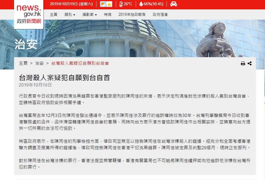 香港特区政府此次发布新闻稿前,香港《星岛日报》18日曾引述消息称,陈同佳原则上同意到台湾自首,深知犯下大错,感到内疚,愿意承担罪责,但不希望被判死刑。对此,台湾《联合报》18日报道引述岛内法律界人士分析,陈如果赴台接受侦办,不符合“自首”条件,顶多算投案,未必能获减刑。