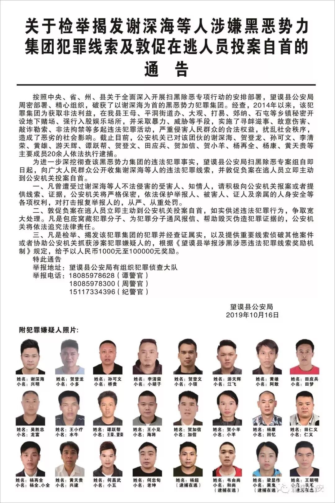 【望谟公安】关于检举揭发谢深海等人涉嫌黑恶势力集团犯罪线索及敦促在逃人员投案自首的通告