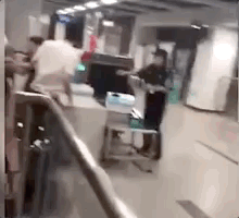 后来冲突不断升级,其中一名白衣男子将安检员摁在安检机器上,另一名白衣男子则持椅子殴打安检员。