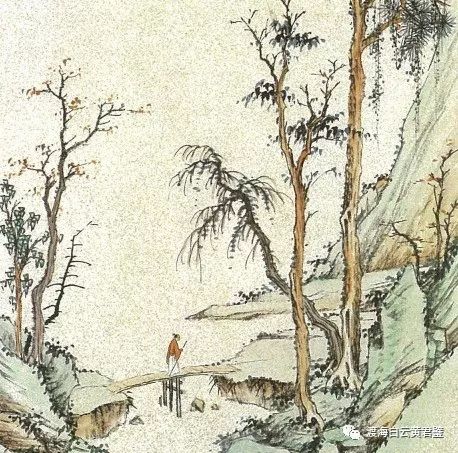 整个画面的笔触细腻,山石的皴笔柔和而精致,树木高而疏朗,秋日的静寂和幽深尽显无遗,人独自走在山间的独木桥,正是“寻行觅得空山句,独绕溪山看云归”。
