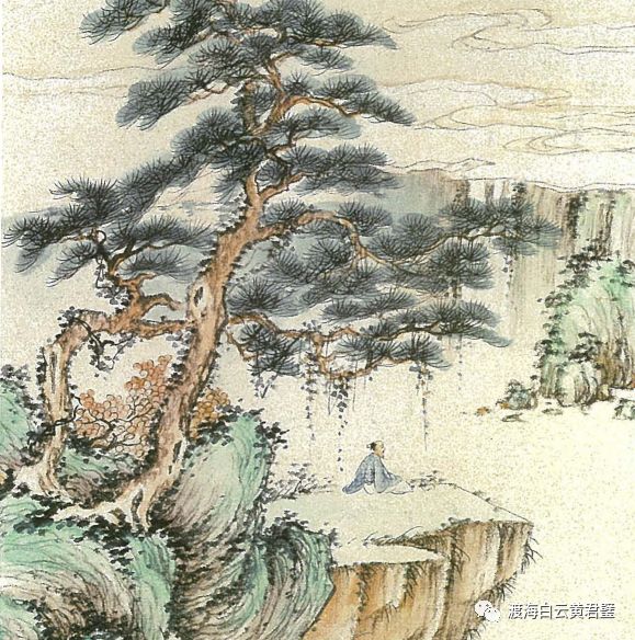 早期黄君璧画瀑布是用细线来勾绘水纹,松树的松针则用墨笔勾勒出,四周用草绿色晕染。只见远处有水纹荡漾,使人仿佛能听到湍急的瀑布在山涧冲击山石的声音,近景有一人栖坐于松树下,享受大自然美妙的声音。《松间听瀑》(局部)1933年