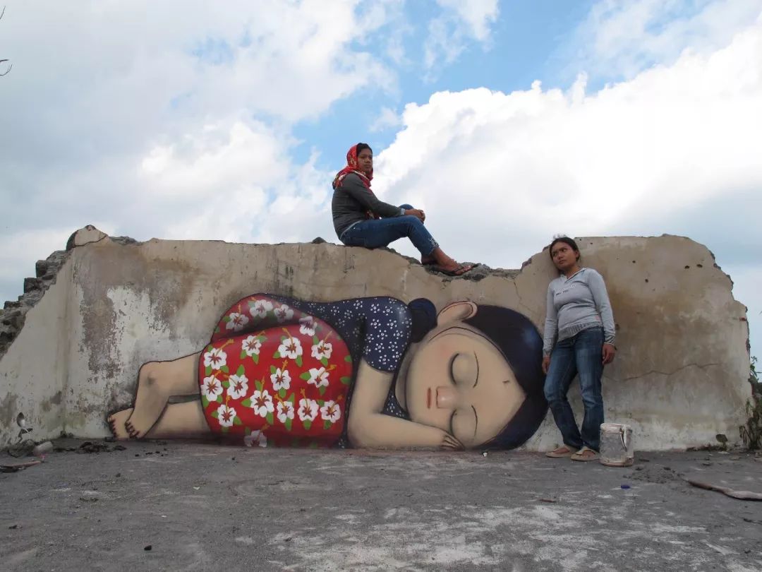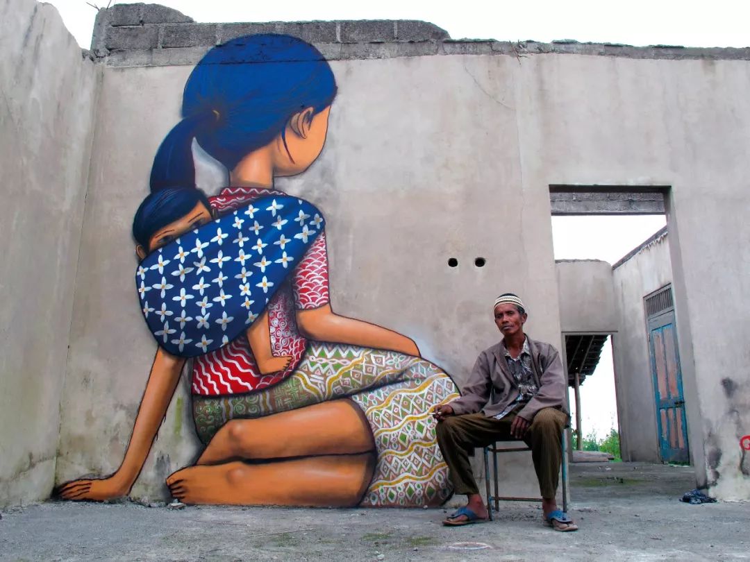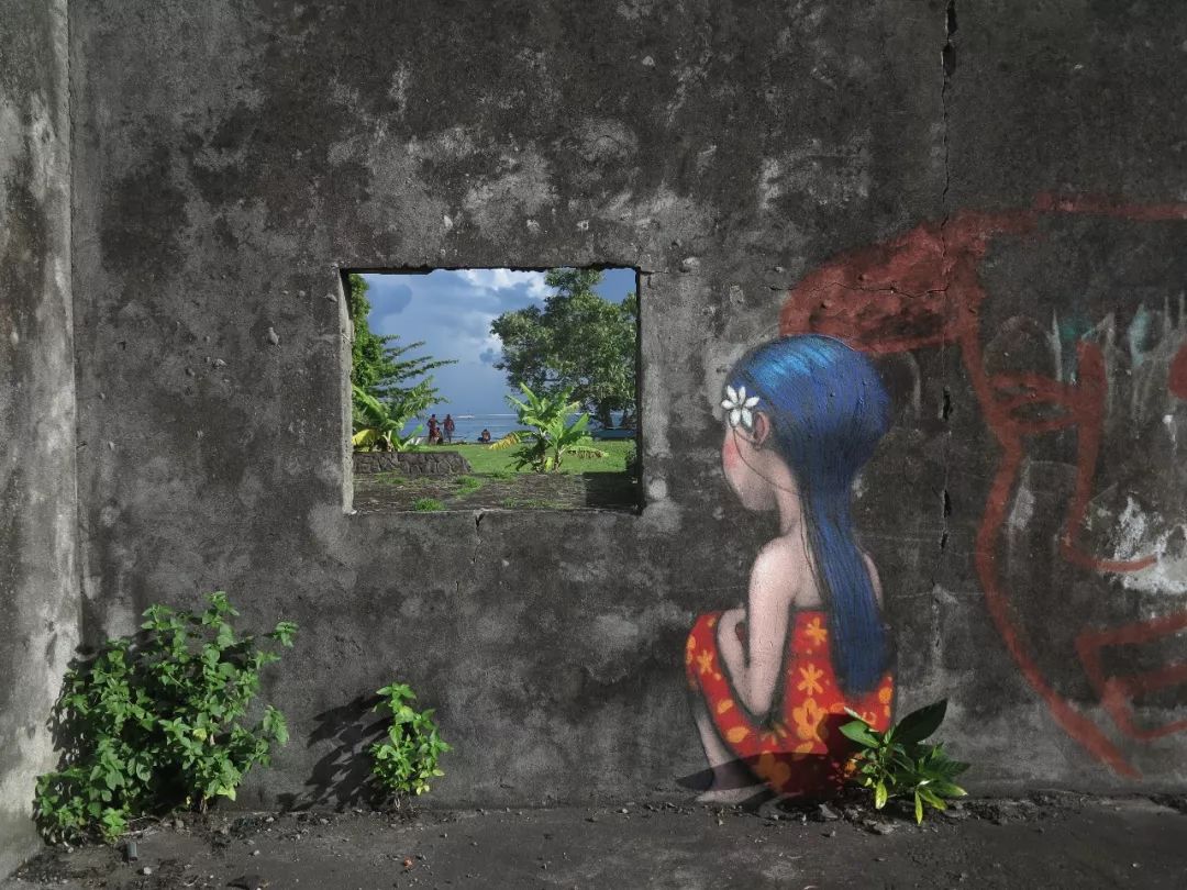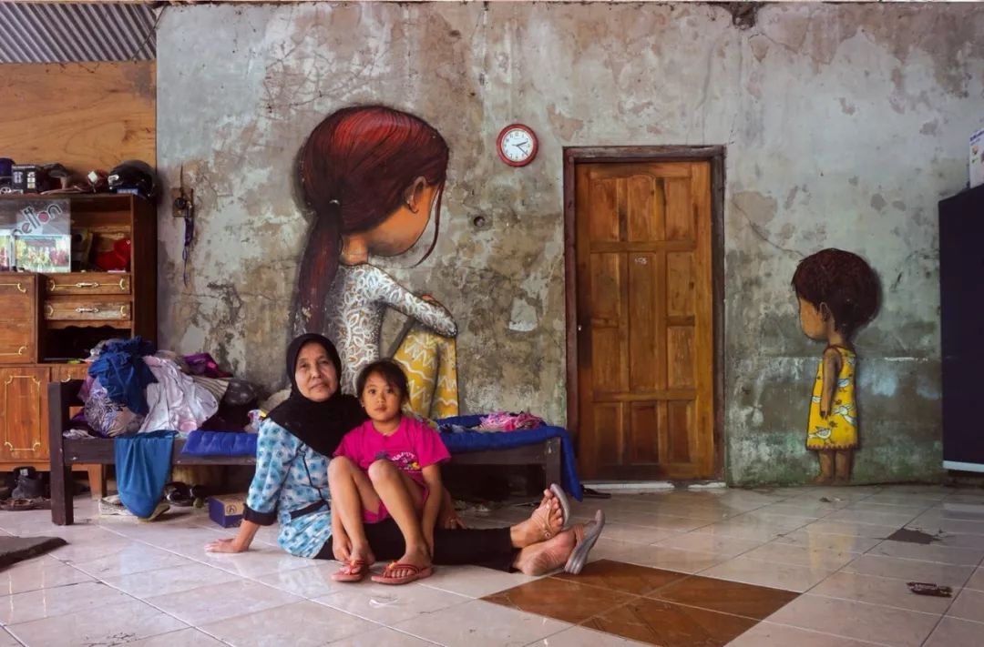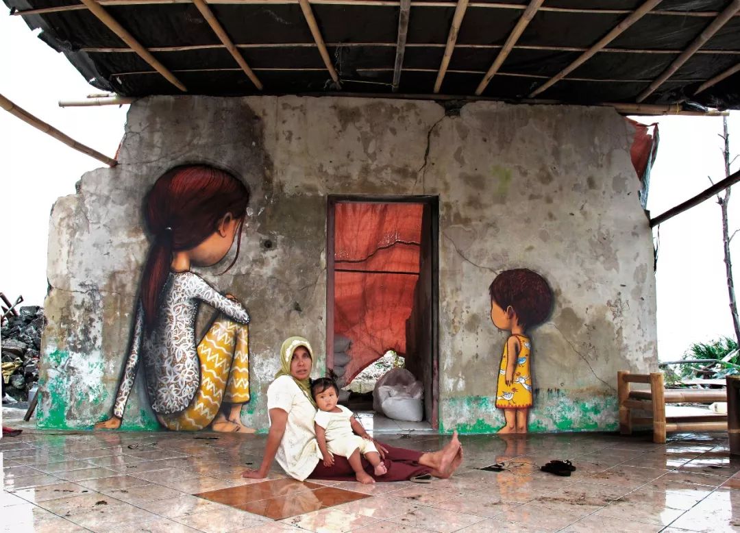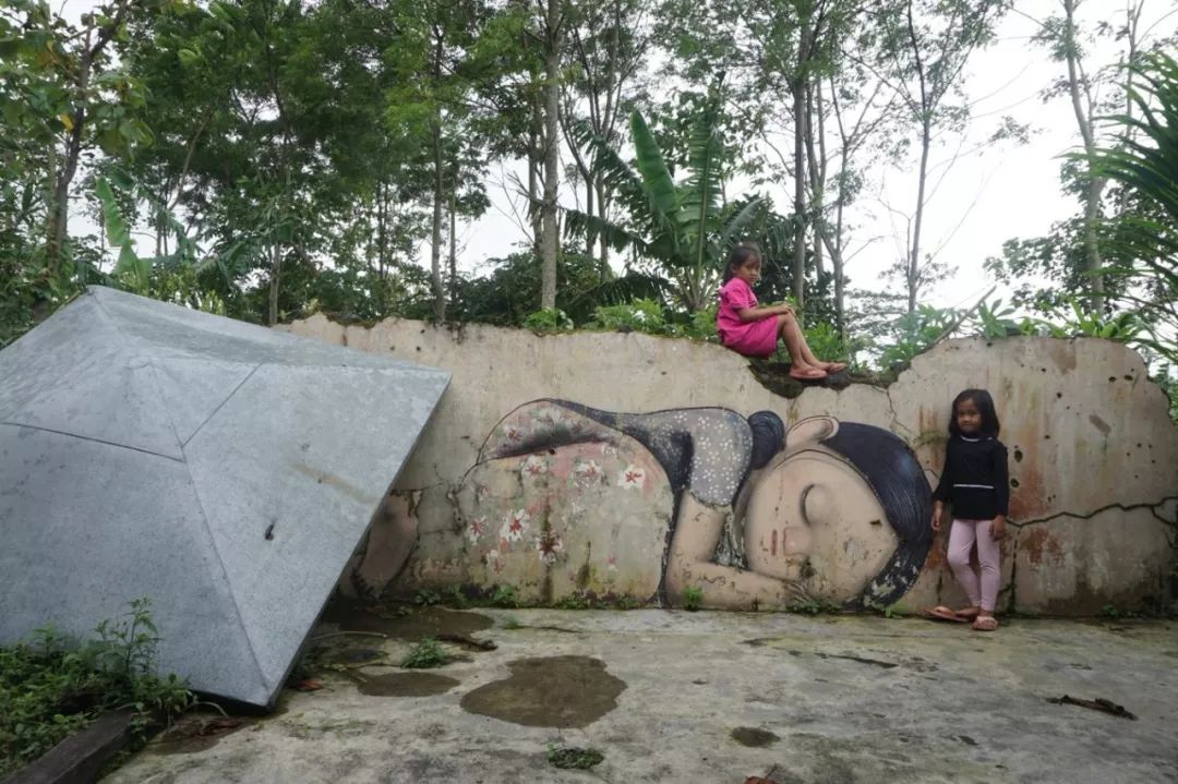 柒先生来到这里后,带着村庄里热爱绘画的孩子们,用彩色的颜料在残垣断壁的墙面上,留下一幅幅印尼小女孩画像。这些色彩亮丽的图案,象征着希望和生命力,让这个满目苍夷的村庄瞬间有了一丝生机