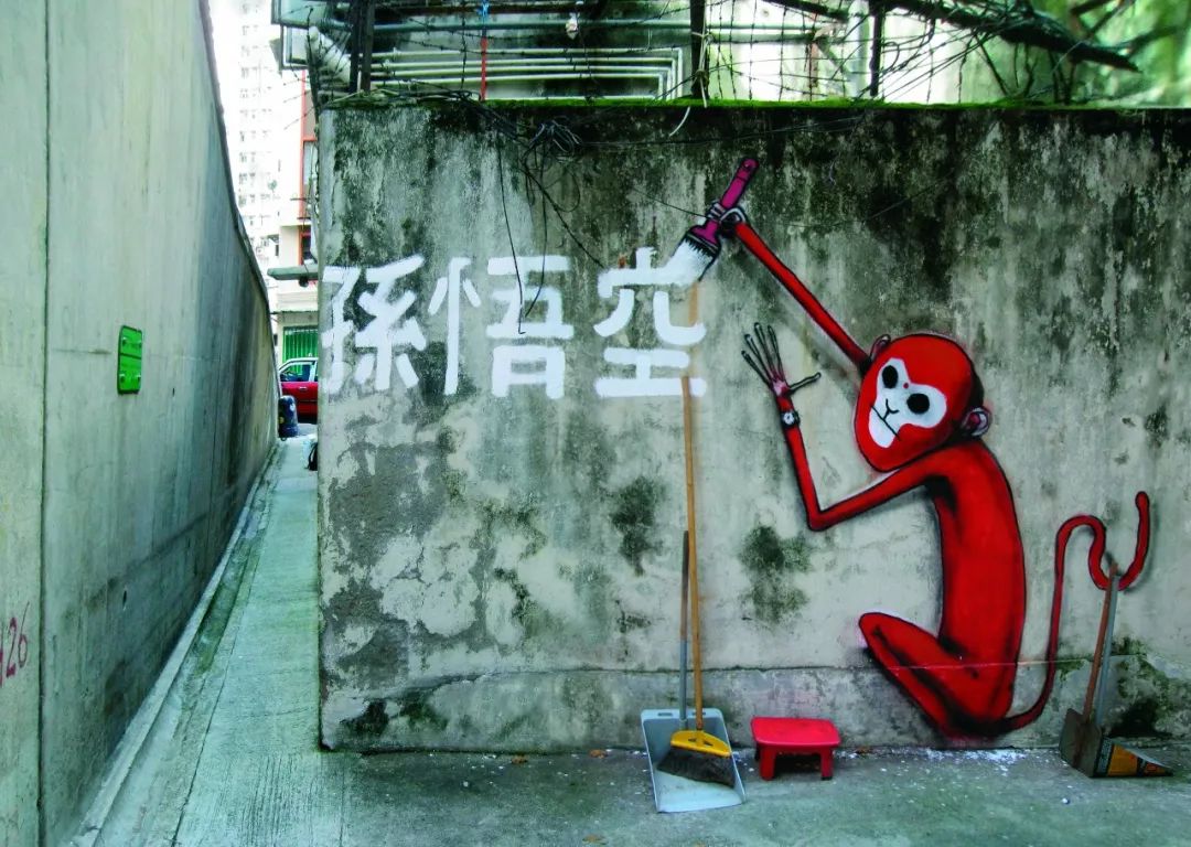 在香港的街头,他画了家喻户晓的孙悟空,以下分别是“一代版苏悟空”和“二代改良版孙悟空”