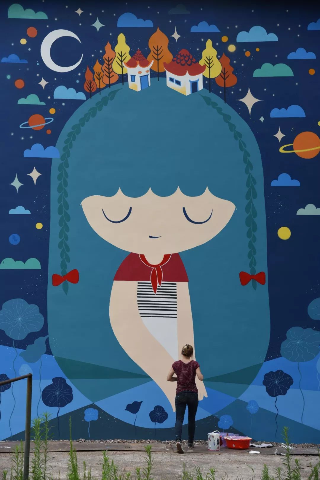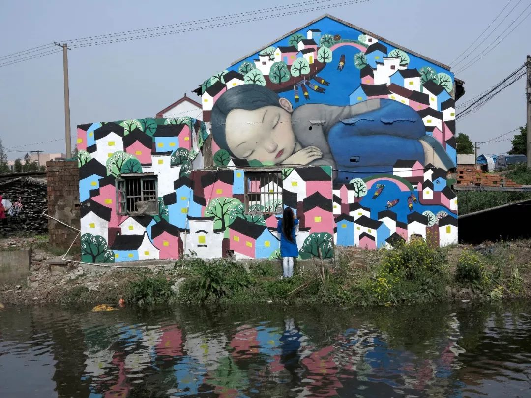 比如这幅甜睡图,是他和当地的农民画家一起创作的。这面墙后来成了这个村子里的一大特色,讲述了一个做梦的孩子,同时又被她的梦保护着