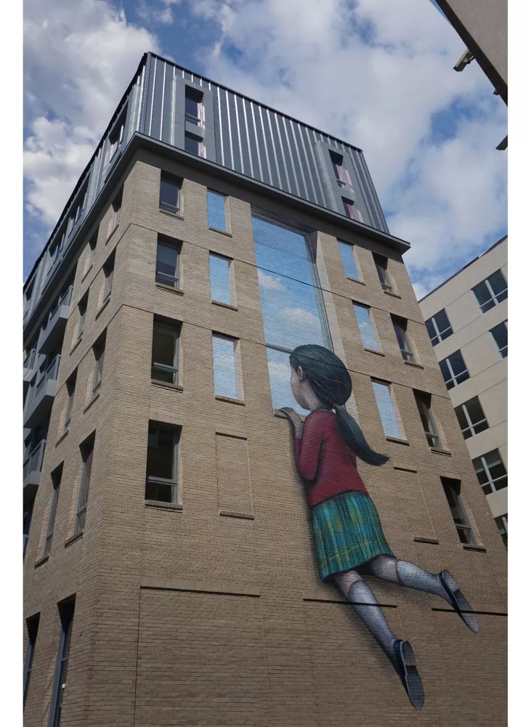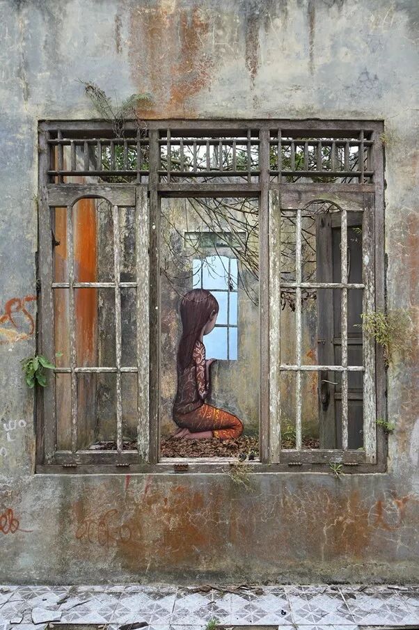柒先生还巧妙地利用“窗”,创作了一系列有趣的墙绘