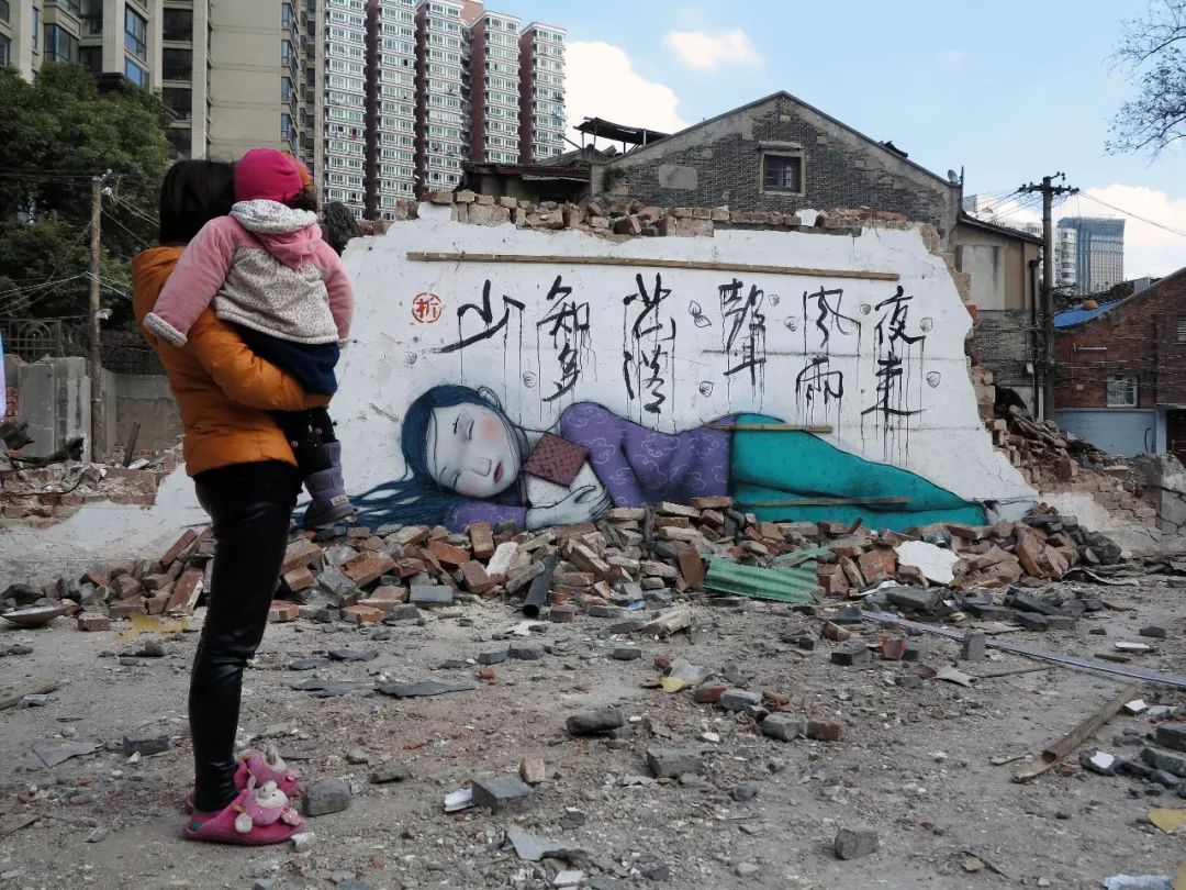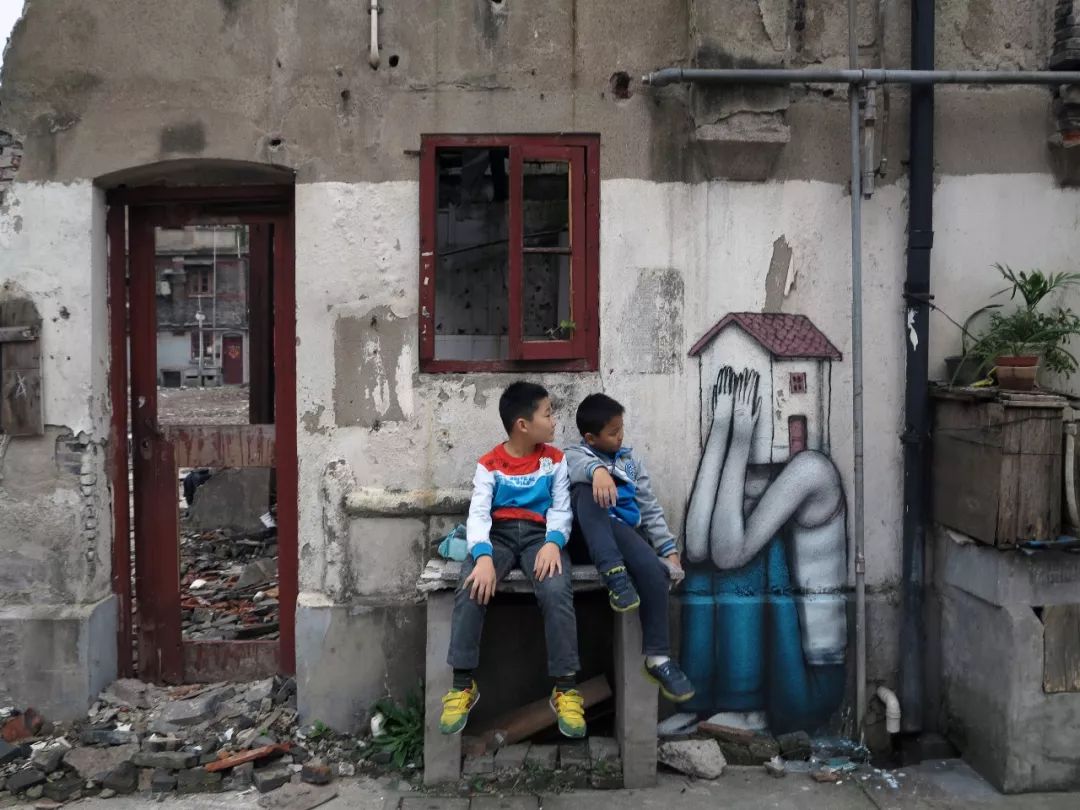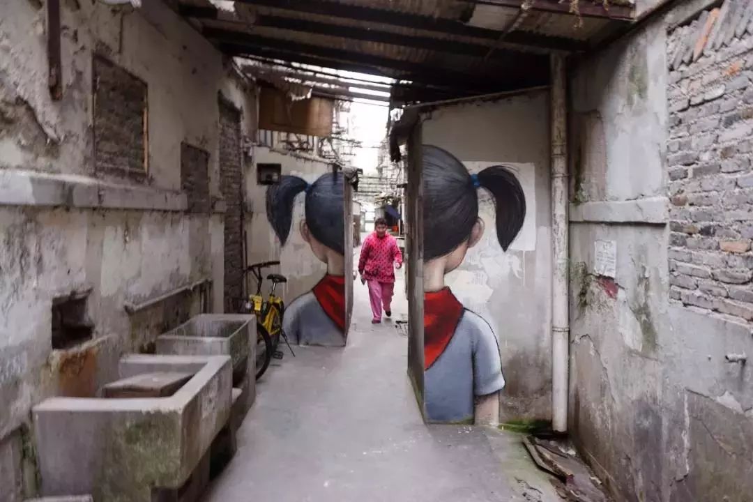 说到柒先生的作品,最吸引人的是,他会结合周围的环境去进行创作,去记录人们当下的生活状态。比如在上海的老街区,这里有很多历史久远的老弄堂。破旧但依然承载着很多当地人的生活,有着浓浓的上海味道,但环境真心影响居住心情