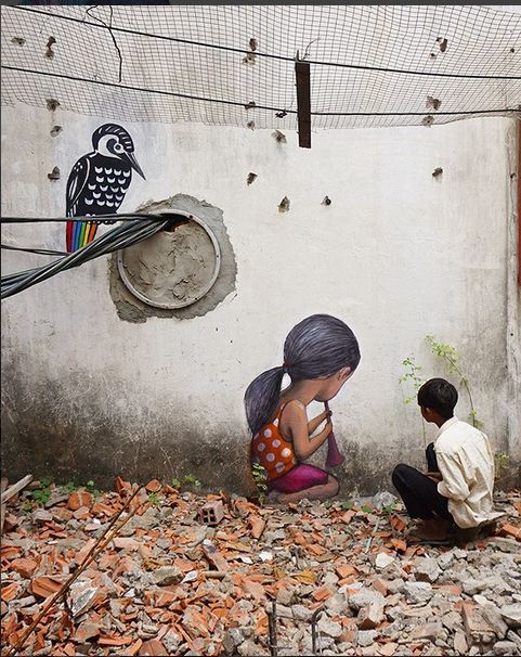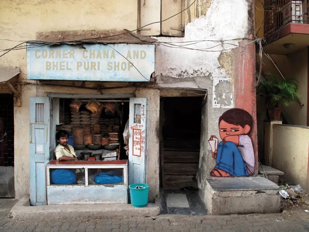 印度孟买的一个小街道,这里破旧不堪,墙皮都掉了一大块,柒先生征求了店铺老板的同意,在店旁边画了一个印度小男孩,画完后,破败的小店立马变得文艺起来