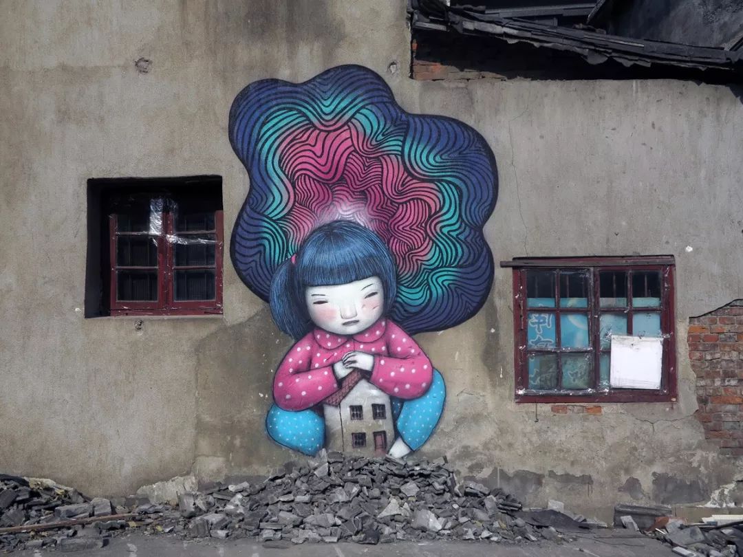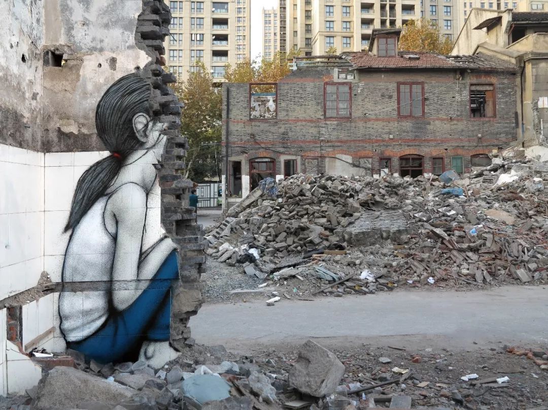 2014年柒先生来到上海,开始尝试美化这些半拆的老街区,他在斑驳破旧的墙上,画下了赋有寓意的图案,顿时这些老街区变得生动活泼了起来,好像在讲述一个故事一样