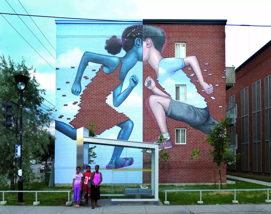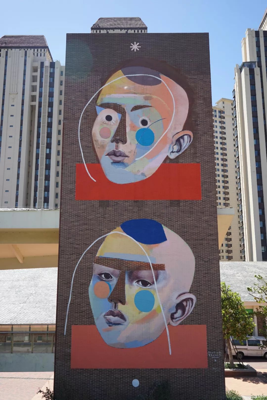 在伊斯兰社区和白人社区分界线,在这个特殊地区,通过墙砖和蓝天的颜色,让两个孩子的形象产生了联系。就像这里的文化,随着前进的脚步,逐渐相融
