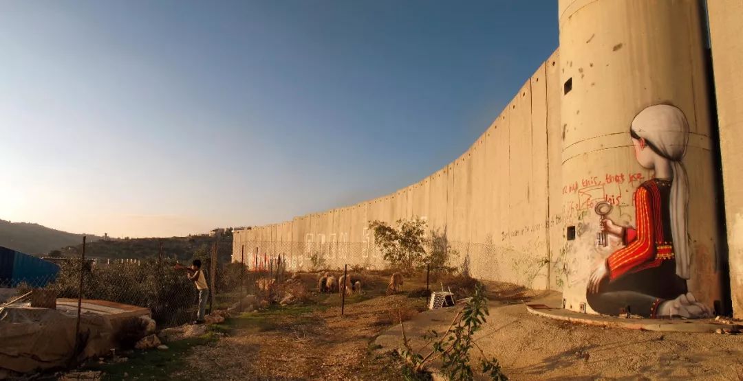柒先生在这面墙上,画了一个遥望以色列的巴勒斯坦女孩,她手里拿着一把家里的钥匙,就像当时逃离战火的巴勒斯坦人,希望有一天能重返家乡