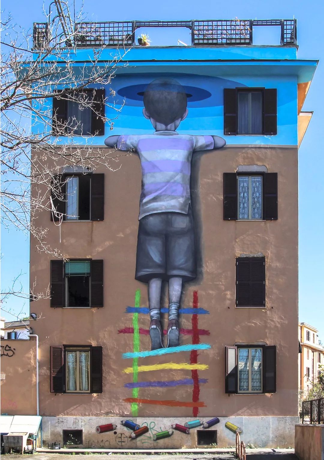 在找不到任何文化特色的地区,他将墙壁与蓝天融为一体,一个小女孩在探望远方的世界