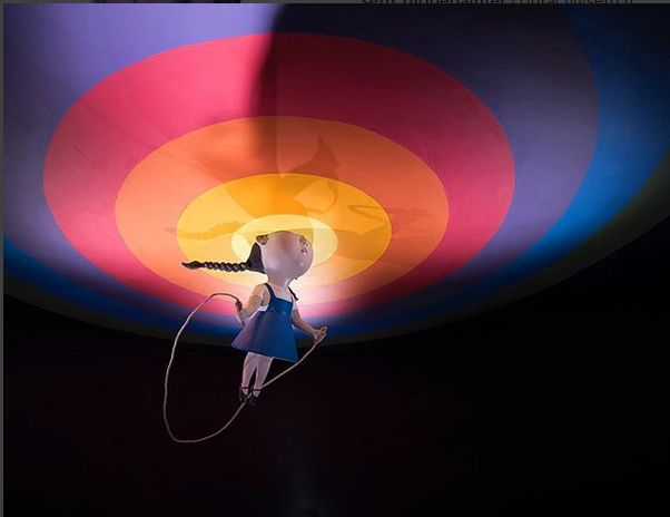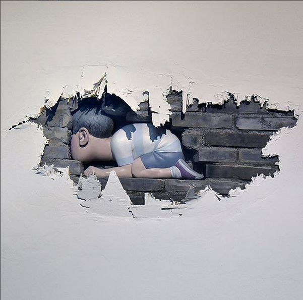 他创作了一系列探入天花板小孩的3D效果图。打破了常见的生活场景,尽管我们已经不再天真,但还是忍不住好奇,头顶的另一个空间是什么样子