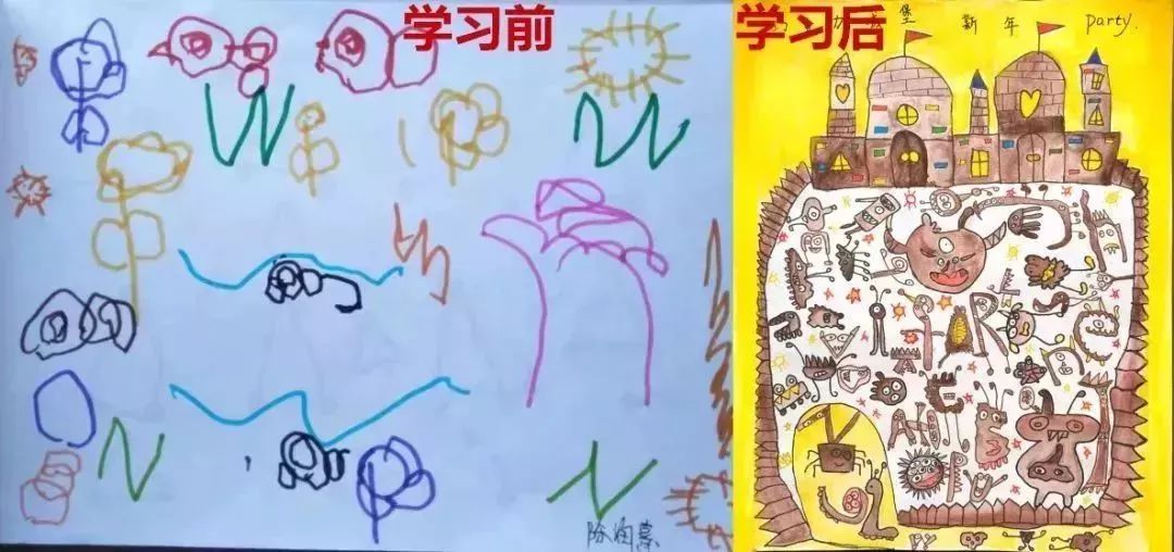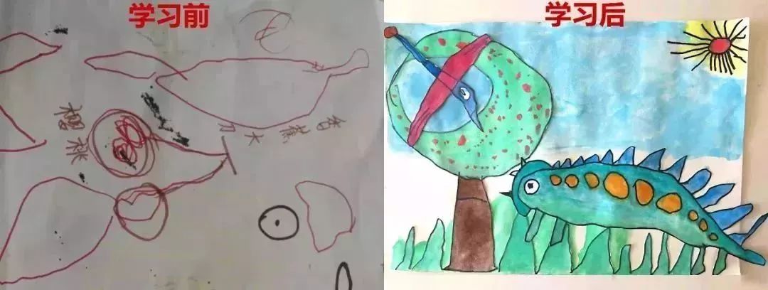 ? 6岁的祺祺小朋友,学习前后的绘画作品对比图 ?