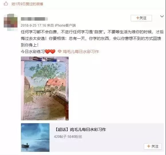 就连娱乐圈的才女徐静蕾,也喜欢画水彩。而且她不仅自己画,还发起了#鸡毛儿每日水彩习作#的超话,进行水彩练习打卡,带动了很多人一起画水彩,爱生活~