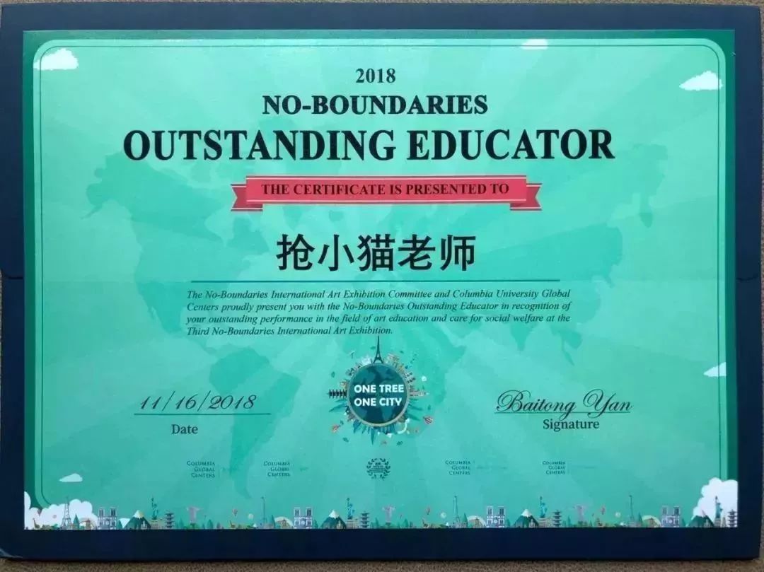▲ 抢小猫老师荣获:哥伦比亚大学全球中心联合NOBO无界组委会授予的——“NOBO无界艺术公益教师”证书