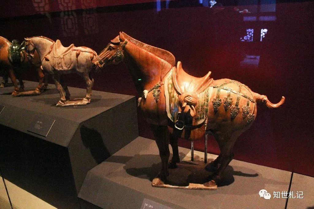 此马静立于长方形底板之上,双足站立,双耳竖立,精神抖擞。唐人爱马,马球与狩猎盛行全国,唐马多膘肥体壮,是唐时国力强盛和向上的社会风貌的体现。这匹有马镫的三彩马为本次展览的一级品之一,也是镇馆之宝之一,还上过央视的《国家宝藏》哦。