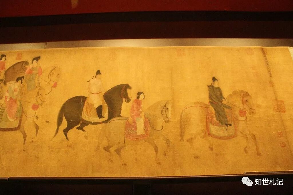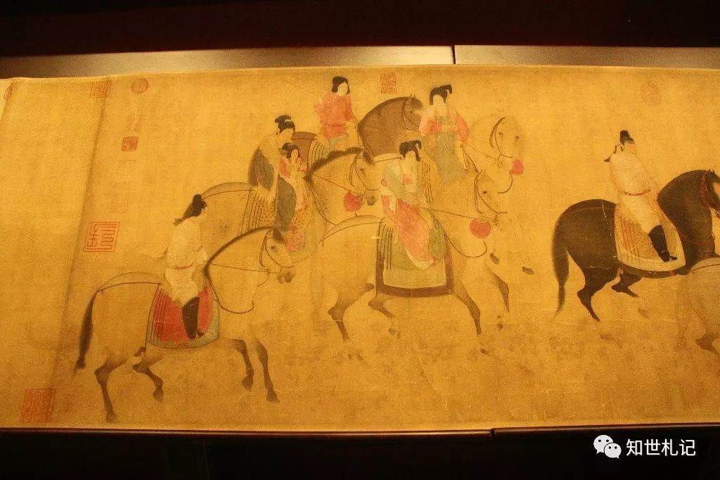 此图为唐代画家张萱所绘,描绘的是天宝十一年唐玄宗的宠妃杨玉环的三姊虢国夫人及其眷从盛装出游的场景。值得一提的是,画家张萱是《簪花仕女图》作者周昉的老师,多画烈女孝子。可以看出此图于仕女图描绘的都是唐时的贵族生活,但人物动作和面部表情以及给观者的直观感受都相对轻松随性,这是因为张萱生活的年代在安史之乱发生前,而周昉在之后,安史之乱发生后唐朝由盛转衰,或许也就是因此周昉的造诣要青出于蓝,正所谓乱世出才俊,时势造才俊。