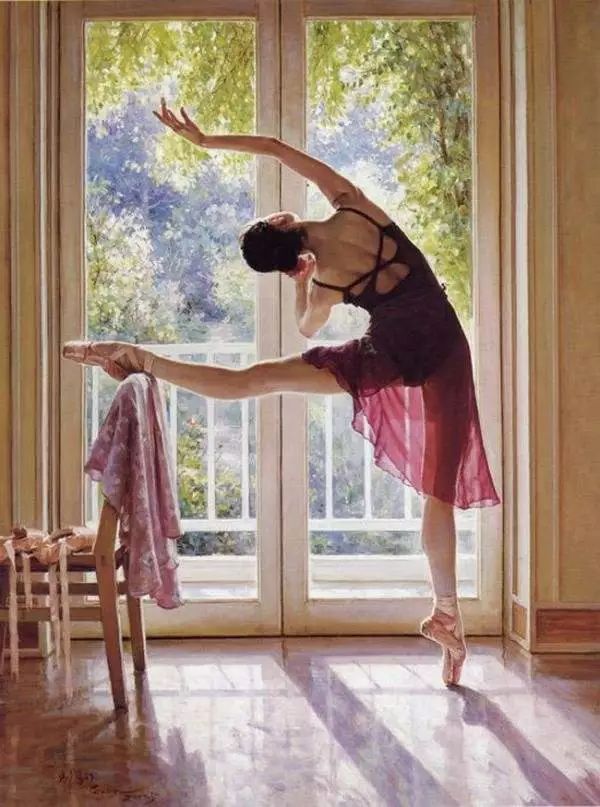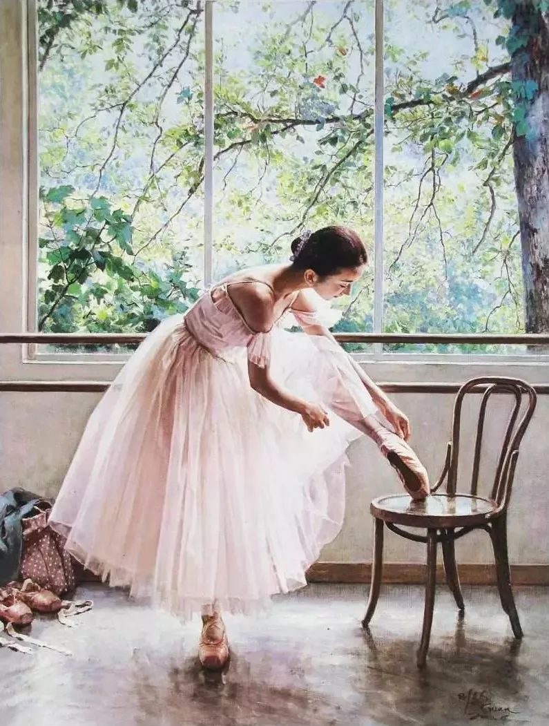 看关则驹的画,不必积蓄多么深厚的艺术理论,不必准备刻意的哲理附和,画面中细腻的笔触,平凡而真实的景象,饱含颂扬美的热情,一点一点地为你打开画家心中那高贵优雅、纯洁无瑕而又洋溢着青春之美的芭蕾世界。