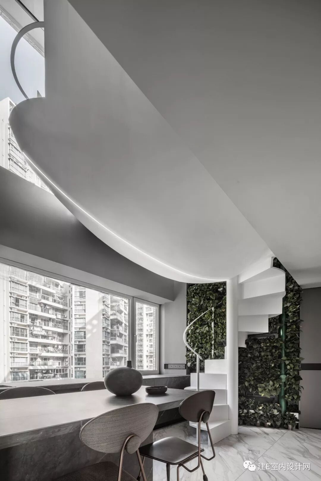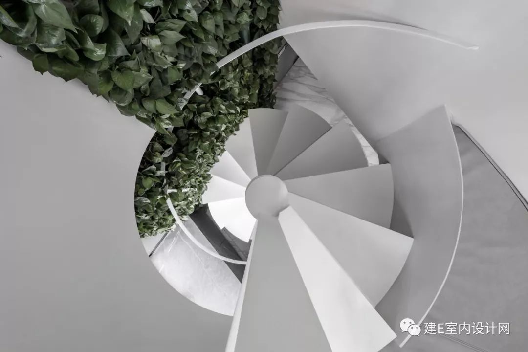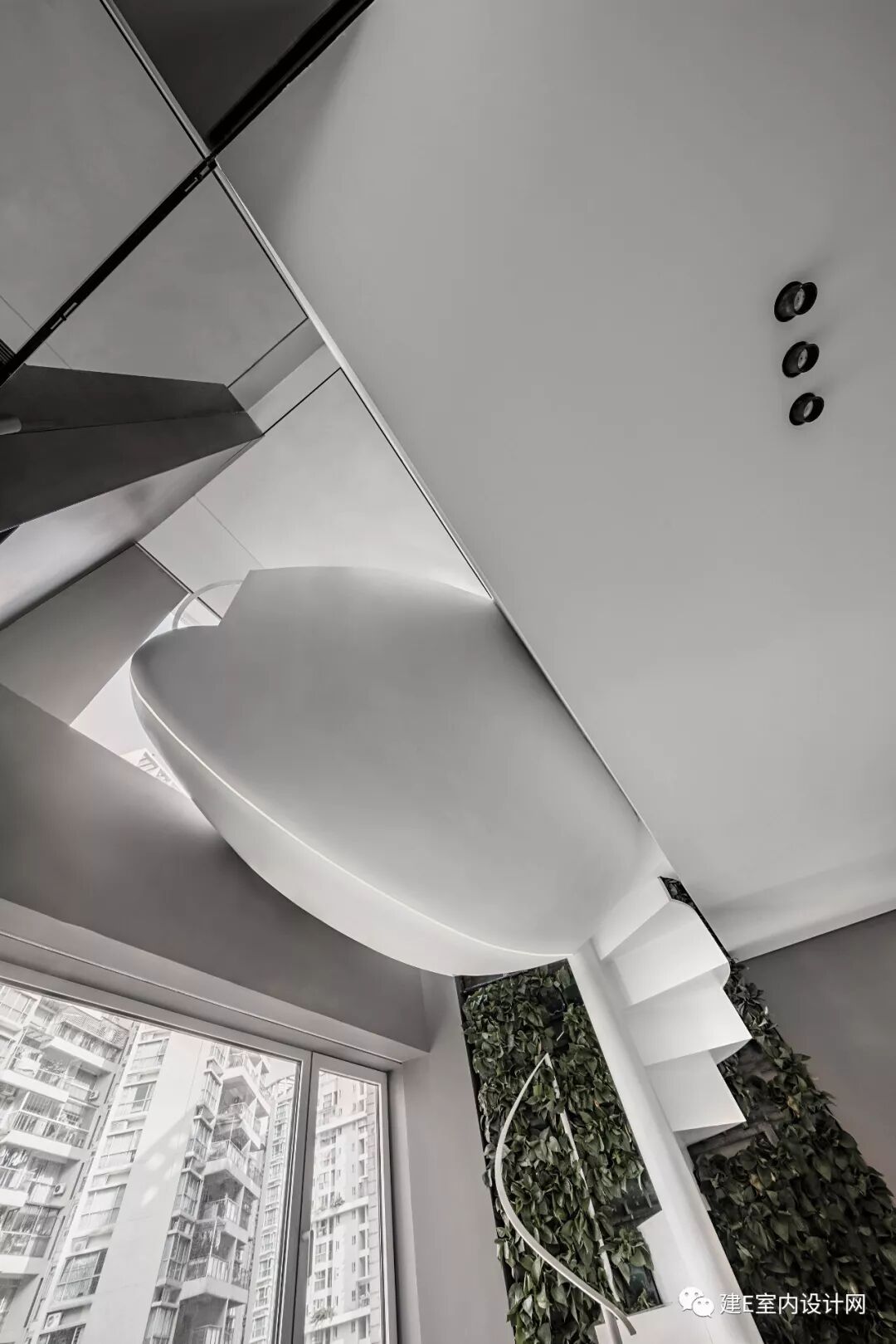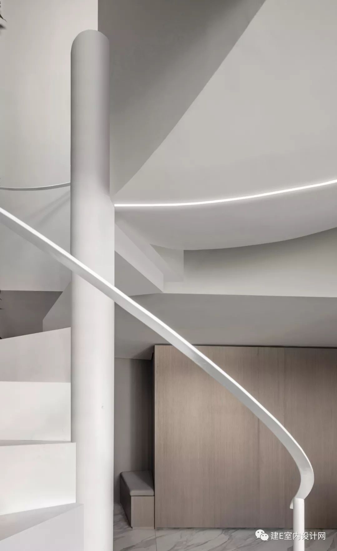 旋转楼梯在增加空间设计感的同时,也节省了空间;楼板的造型设计成弧形的“蛋壳”,与旋转楼梯的感觉完美融合;小中空的设计,令6m多的挑高仍旧可以被明显感知,同时室内采光也大大提升,整个空间高阔大气,明亮通透。