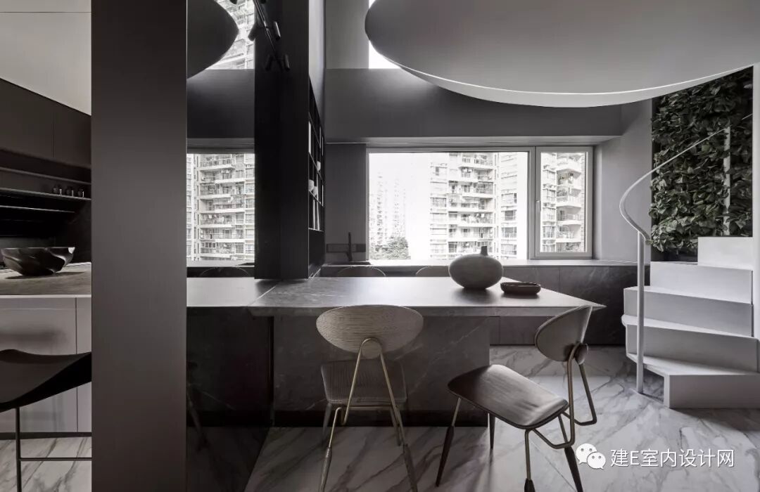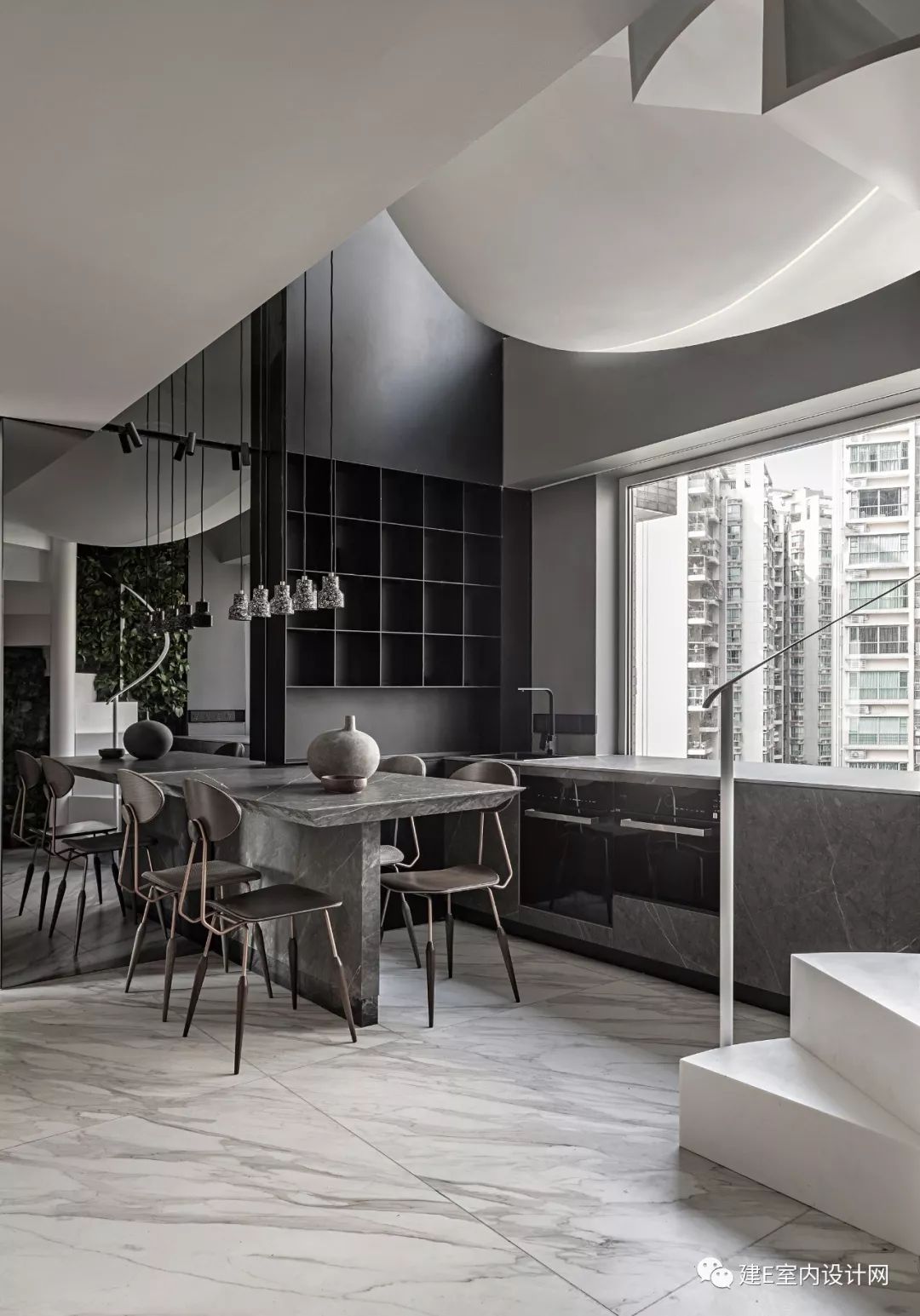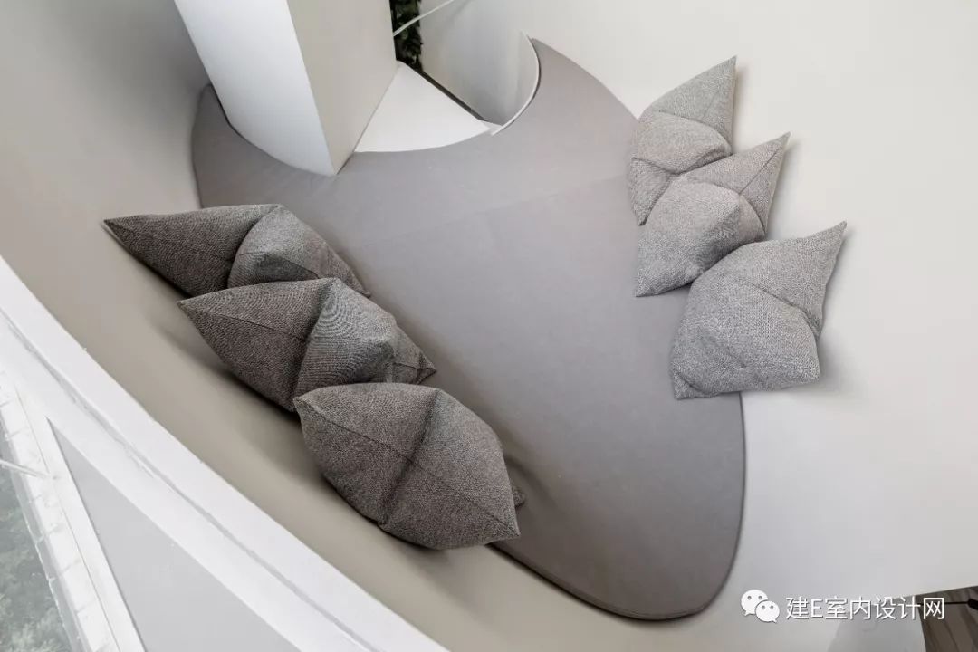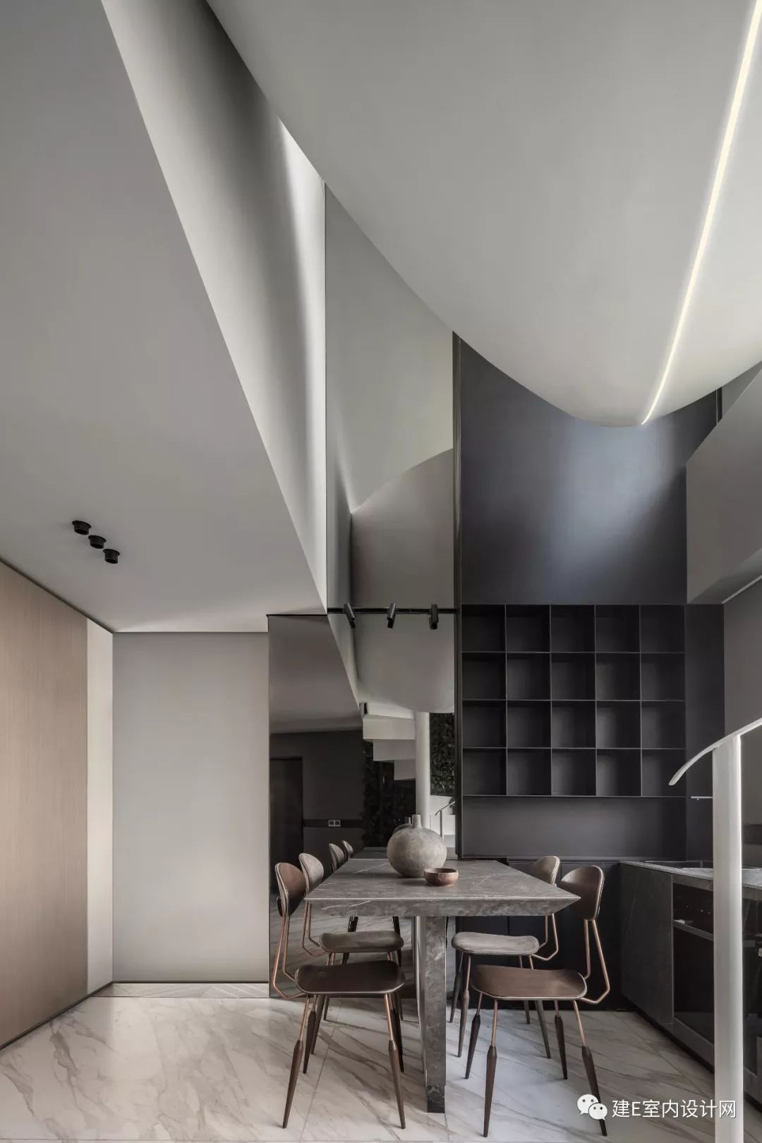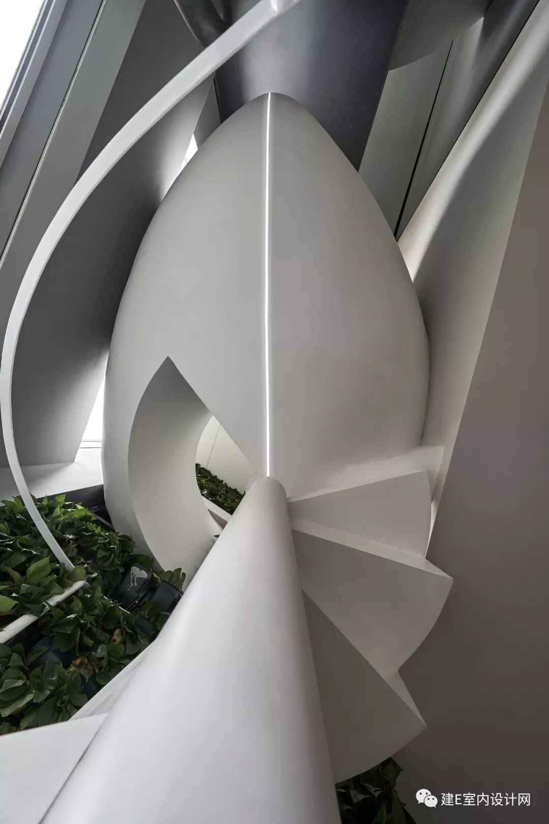 旋转楼梯在增加空间设计感的同时,也节省了空间;楼板的造型设计成弧形的“蛋壳”,与旋转楼梯的感觉完美融合;小中空的设计,令6m多的挑高仍旧可以被明显感知,同时室内采光也大大提升,整个空间高阔大气,明亮通透。