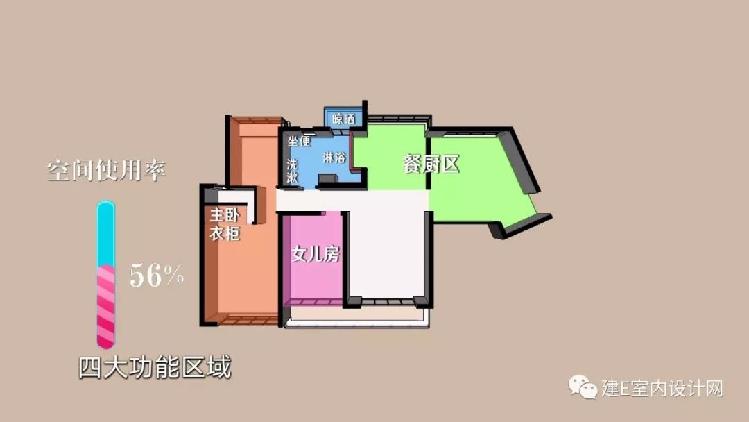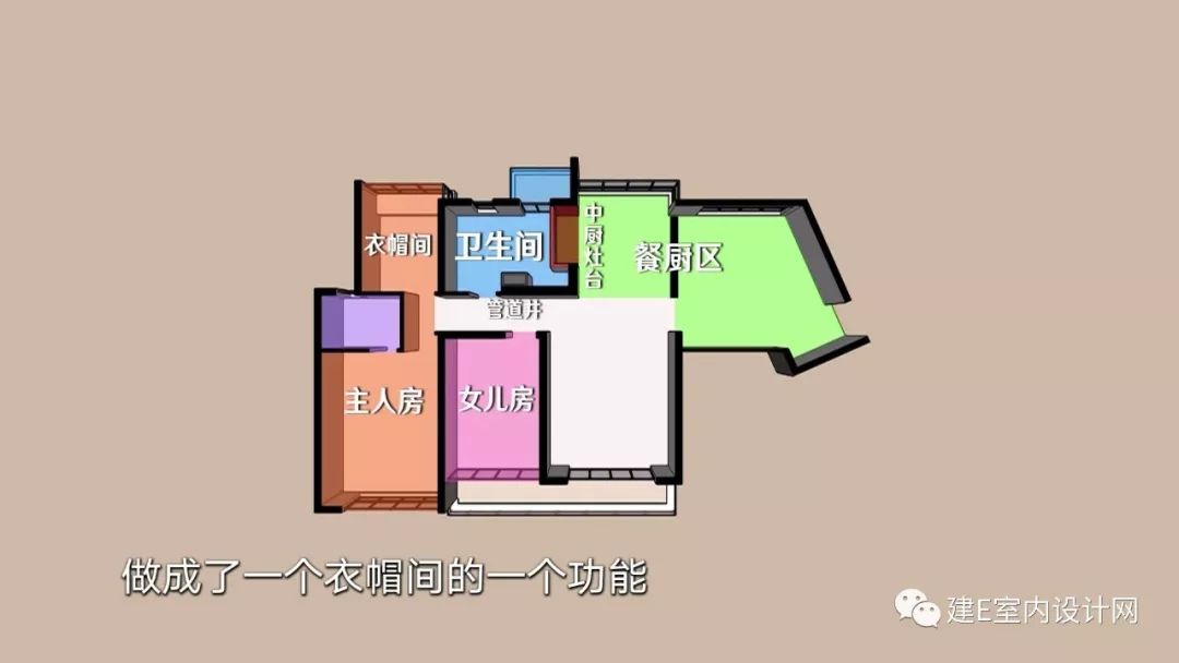 无人使用的客卧和入户花园变成了女儿房和餐厨区,次卫中被废弃的浴缸位置则做成衣柜纳入主卧空间,而扩大后的主卫包含了洗坐淋浴和晾晒四大功能区域,整个房子的利用率大大提高。