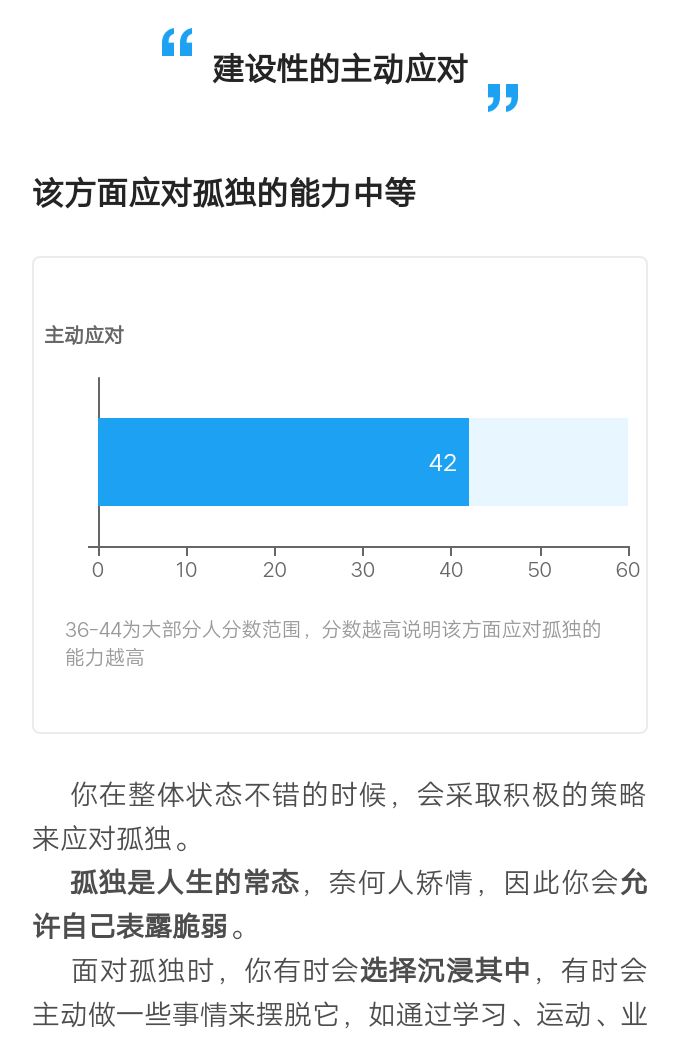 这个测试将从情绪表达和社会应对、建设性的主动应对、反复思考和回避应对等维度评估你应对孤独的能力,并针对你的现状给出专业的建议,让你善用孤独,成就自我。