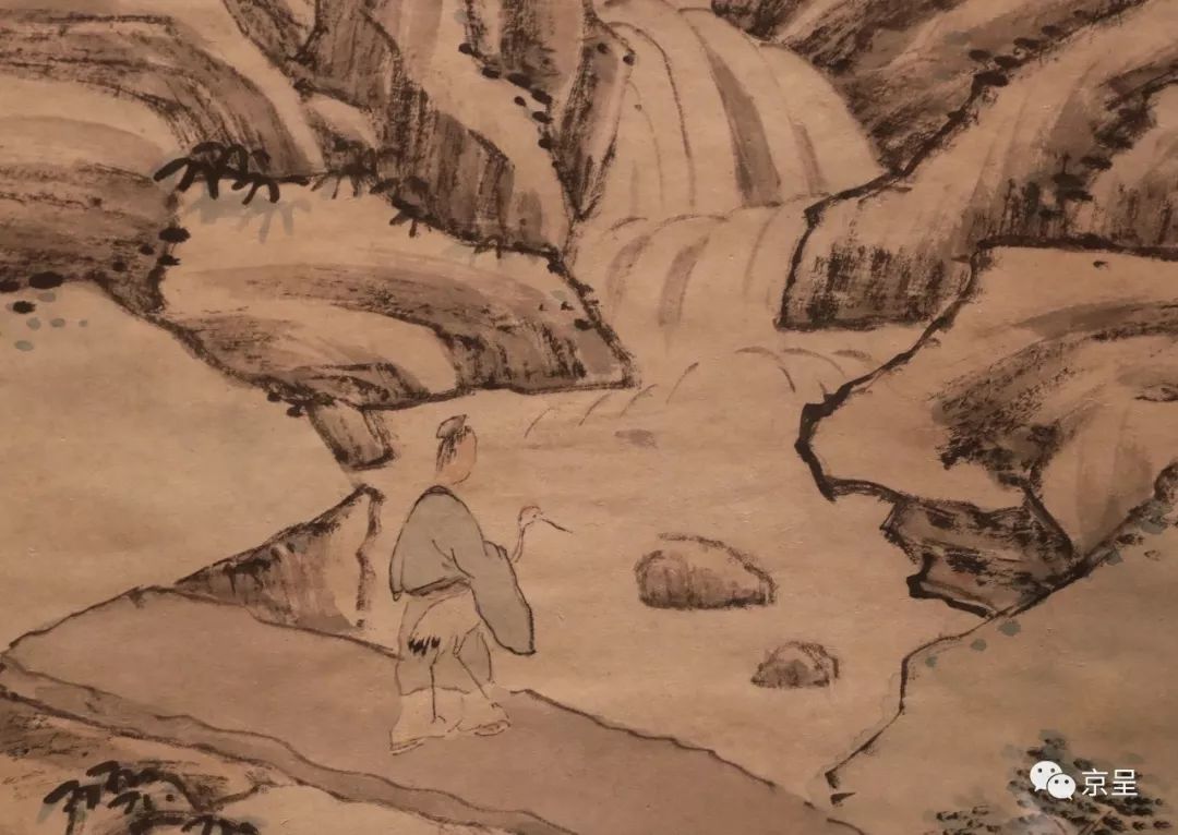 仔细看,溪流边还有一位小童正在欣赏琴声泉鸣,手里还抱着一只仙鹤。