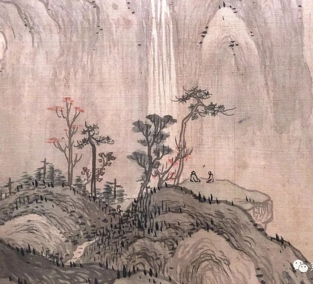 仔细看图画下方,几树红枫旁,两位高士悠然坐卧,正在听泉论道。