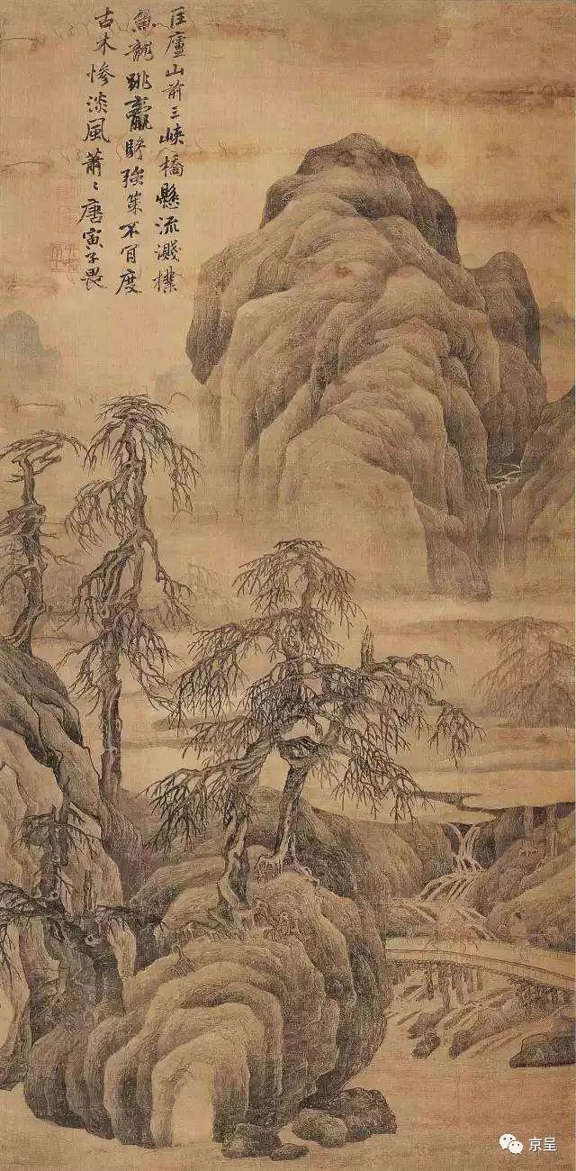 远处庐山高远,白云深深,中间嵯峨的岩石上,古树秋风,枝桠纷披,一片萧索,唯山间瀑流一道,几经曲折径流木桥之下。