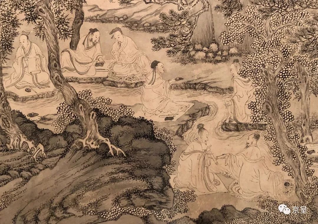 林中文人雅士沿着流觞曲水列坐,饮酒、为文、交谈正欢。