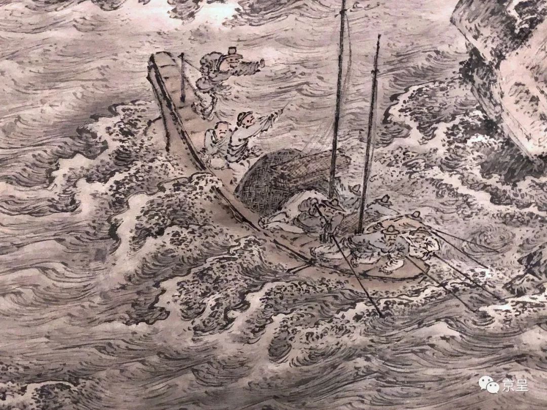 再看湖中,风浪中一只舟楫正在湖中搏击浪涌,船夫各个身体紧绷,紧张的气氛扑面而来。