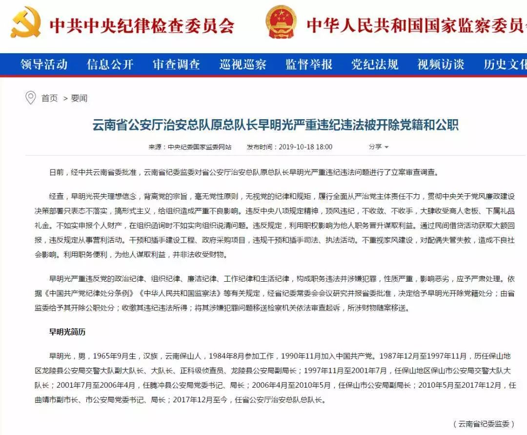 经查,早明光丧失理想信念,背离党的宗旨,毫无党性原则,无视党的纪律和规矩,履行全面从严治党主体责任不力,贯彻中央关于党风廉政建设决策部署只表态不落实,搞形式主义,给组织造成严重不良影响。违反中央八项规定精神,顶风违纪,不收敛、不收手,大肆收受商人老板、下属礼品礼金。不如实申报个人财产,在组织函询时不如实向组织说清问题。违反规定,利用职权影响为他人职务晋升谋取利益。通过民间借贷活动获取大额回报,违反规定从事营利活动。干预和插手建设工程、政府采购项目,违规干预和插手司法、执法活动。不重视家风建设,对配偶失管失教,造成不良社会影响。利用职务便利,为他人谋取利益,并非法收受财物。早明光严重违反党的政治纪律、组织纪律、廉洁纪律、工作纪律和生活纪律,构成职务违法并涉嫌犯罪,性质严重,影响恶劣,应予严肃处理。依据《中国共产党纪律处分条例》《中华人民共和国监察法》等有关规定,经省纪委常委会会议研究并报省委批准,决定给予早明光开除党籍处分;由省监委给予其开除公职处分;收缴其违纪违法所得;将其涉嫌犯罪问题移送检察机关依法审查起诉,所涉财物随案移送。早明光简历早明光,男,1965年9月生,汉族,云南保山人,1984年8月参加工作,1990年11月加入中国共产党。1987年12月至1997年11月,历任保山地区龙陵县公安局交警大队副大队长、大队长、正科级侦查员、龙陵县公安局副局长;1997年11月至2001年7月,任保山地区保山市公安局交警大队大队长;2001年7月至2006年4月,任腾冲县公安局党委书记、局长;2006年4月至2010年5月,任保山市公安局副局长;2010年5月至2017年12月,任曲靖市副市长、市公安局党委书记、局长;2017年12月至今,任省公安厅治安总队总队长。转发,是最好的支持!