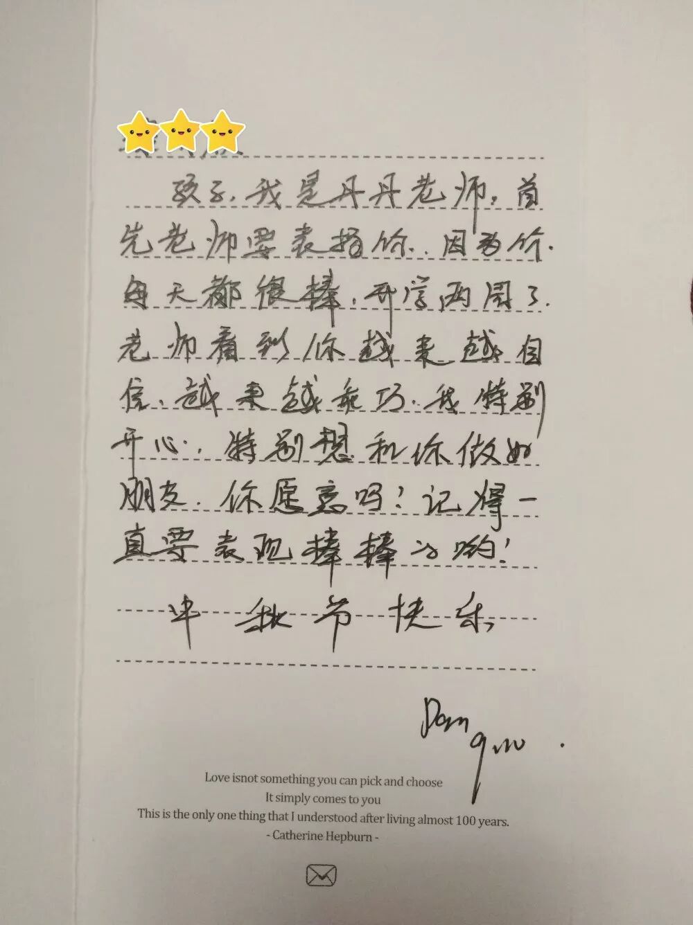 回首数数,女儿到今天已入学45天了,每一天妈妈都看到你一点点的进步。记得入学的第二周,收到了老师送给你的卡片,卡片寄语里的内容说明你已明白自己是名小学生。有秩序感,能独立自主处理小事务啦。