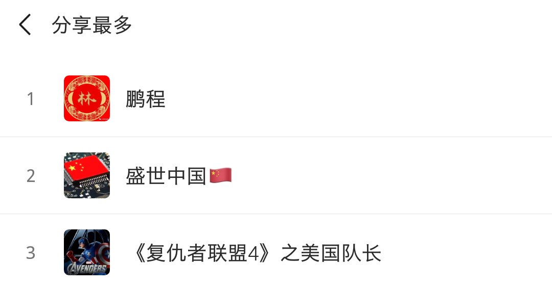 分享最多:鹏程、盛世中国、《复仇者联盟4》之美国队长。