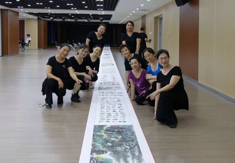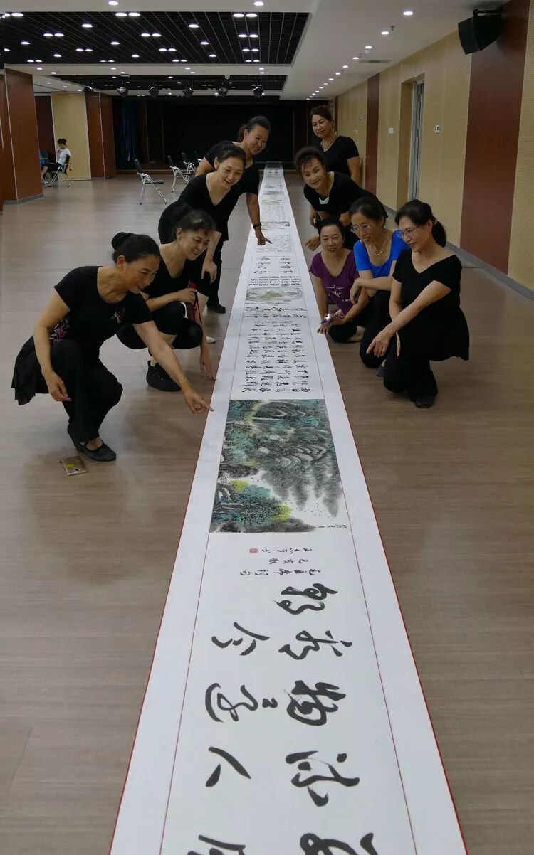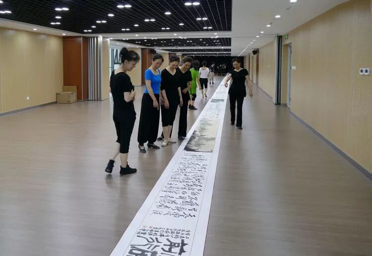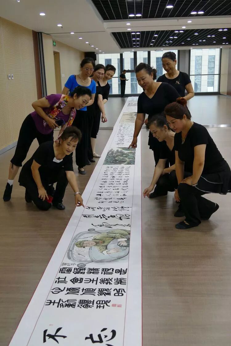 舞蹈队姐妹们欣赏铁军的长符书法作品