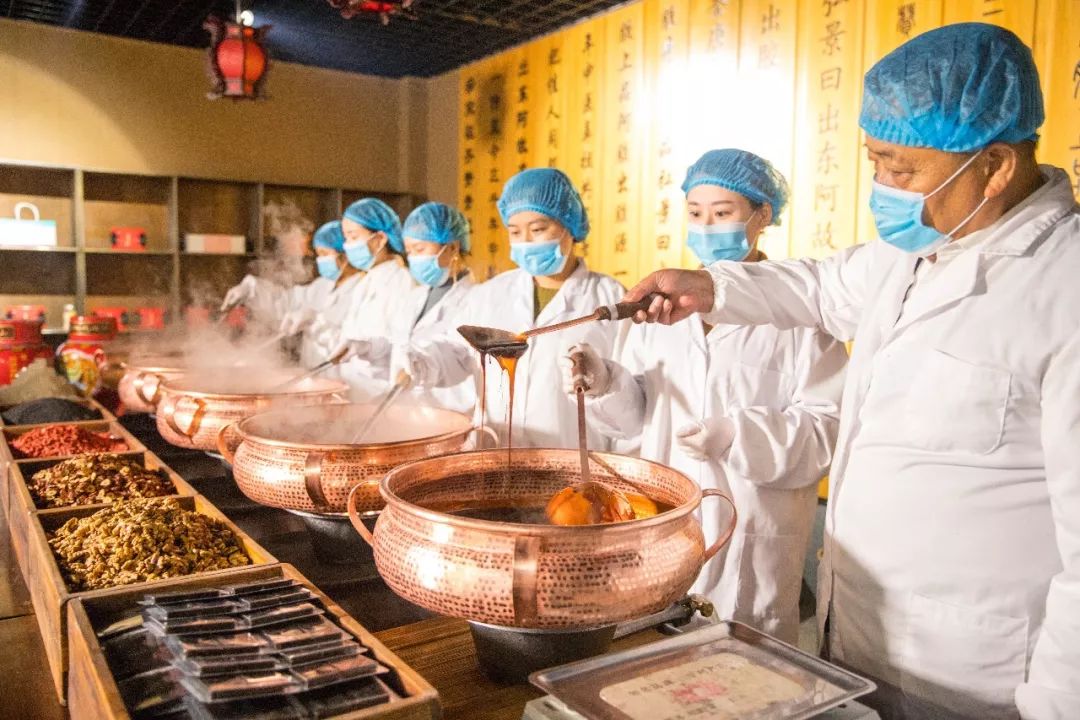 所有的手工制作者都拿着一口铜锅,在悉心熬制阿胶糕。