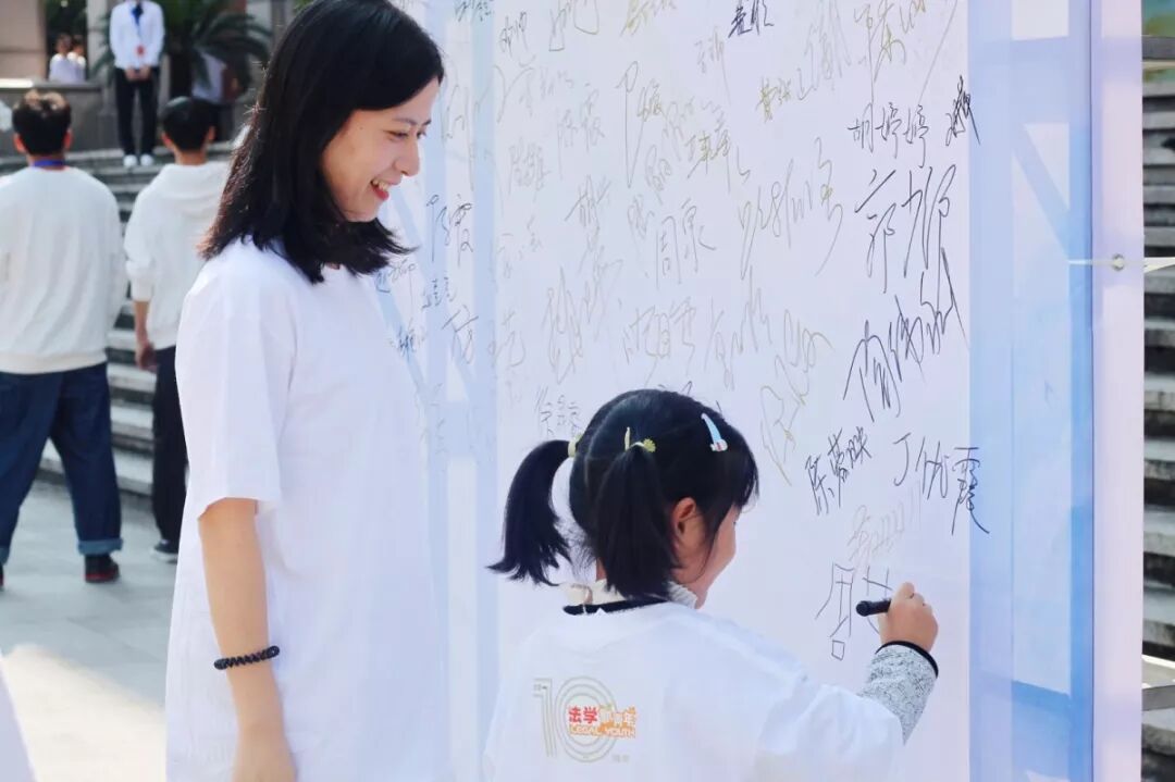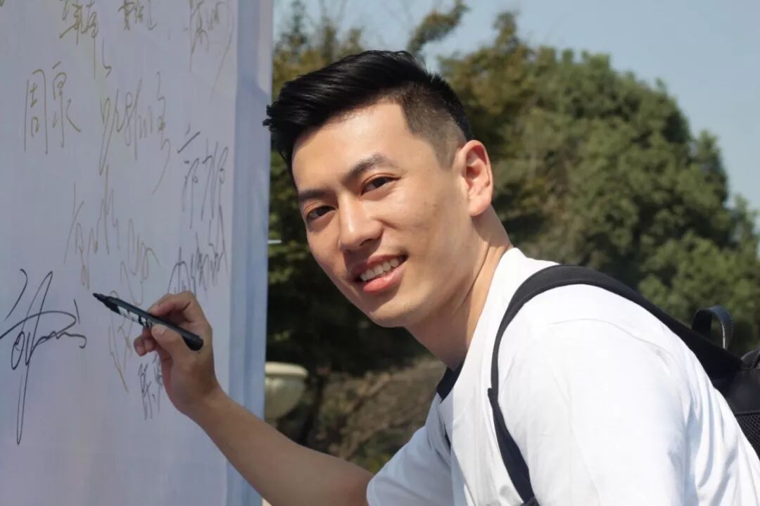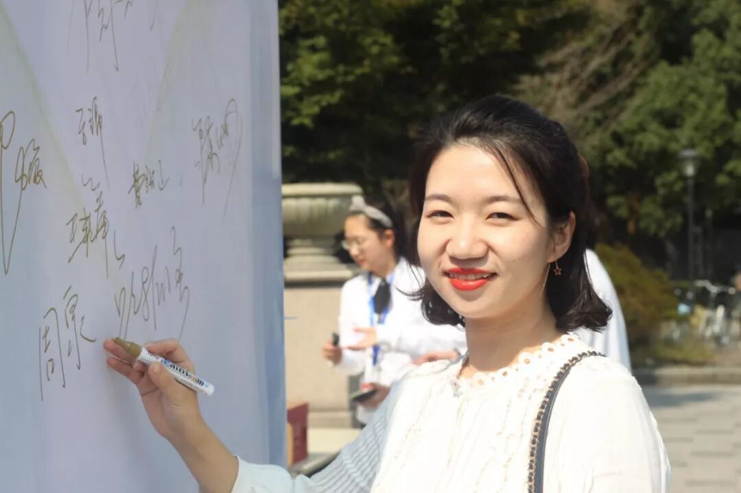 法学楼前,校友们在喷绘上签上自己的名字,互照留念。流年易逝,时光易老,愿多年后仍是少年模样。