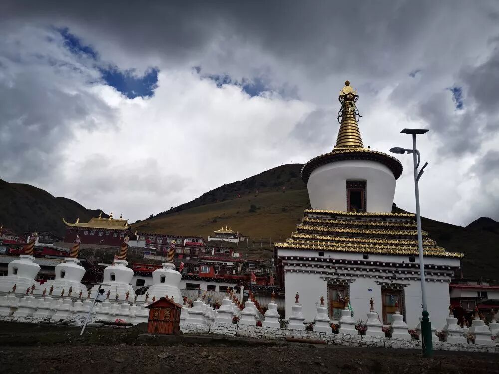 外面下起了大雨,师父的身上都淋湿了,领着大家去绕佛塔,一路爬坡我高反严重,走一段休息下,慧阳师兄一直照顾我,心想爬也要爬上去,到了佛塔绕佛塔三圈,绕佛塔一点都没有高反的反应,走的很快,感恩师父佛父佛母加持。师父当年修法的地方太艰苦了,跟随师圣来到圣地太殊胜了。