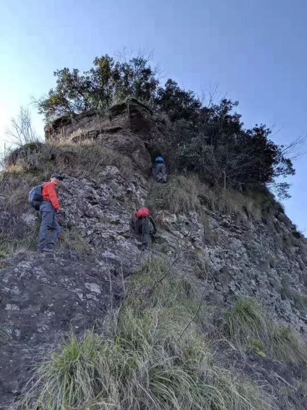 徒步开始,脚下就是陡峭的山坡。穿越杂树丛林,再攀爬到山脊,前面仍然是陡峭的山脊路,需要脚手并用。行至每一处山头,眼前总会岀现悬崖峭壁。历经N个山头,终于支撑到三峰山最高峰——大尖山前,不禁让人倒吸一口凉气。此处有一段二十米左右、宽幅不过三十公分的悬崖绝壁,远远望去,犹如薄薄的刀刃倒竖在两峰之间,其险之处两侧竟无一棵树木,只有几簇生命力极其旺盛的茅草。此处,只能战战兢兢地趴着爬行,或双腿骑在这绝壁上慢慢向最高峰移动,甚是刺激和惊险。过后回望,还是心有余悸。过了最险处,前面就是本次最高峰大尖山顶。
