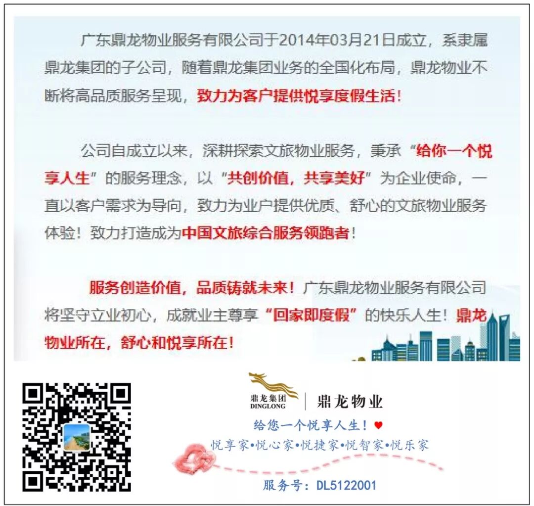 客服部:鼎龙管家为您提供优质高效服务,风雨无阻每天晨练礼节礼仪;日常巡区排查安全隐患,时刻紧守人过地净服务宗旨,鼎龙物业人人都是保洁员,工完场清;情系业主,尽心倾听业主诉求,用实际行动赢取业主放心和满意;齐心协力为业主和游客排忧解难,累积日常接待解决报事报修问题逾百起,累计电话解决报事报修问题数十起。