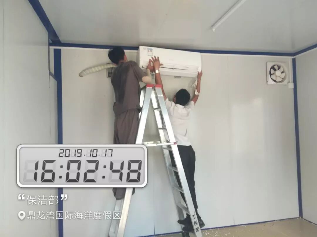 工程部:万众一心解决工程板块问题,修复安全设施;对园区内裸露、腐蚀、动物啃咬电线整改;维修园区内破损广告牌;维修园区路灯;更换婚礼广场投灯;对线路电源电箱检查监测;对楼房水管进行检查维修;对园区空调进行检查维修;拆除马路损坏的装饰;对别墅区进行消杀防治白蚁;对工程工作区进行危险标示等。
