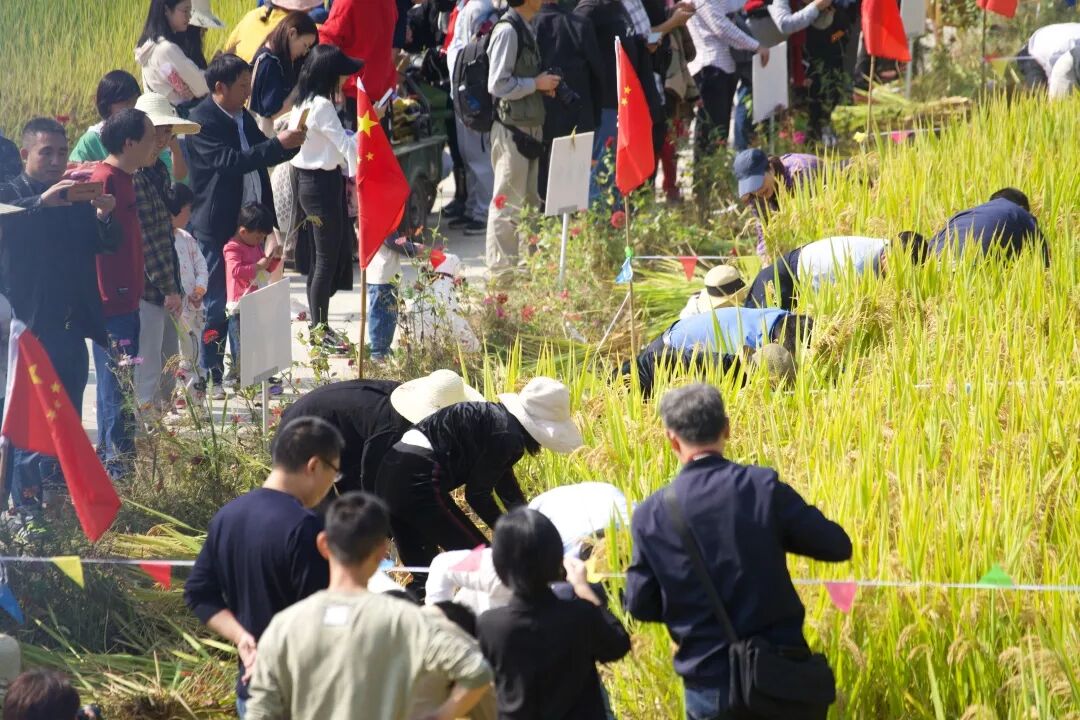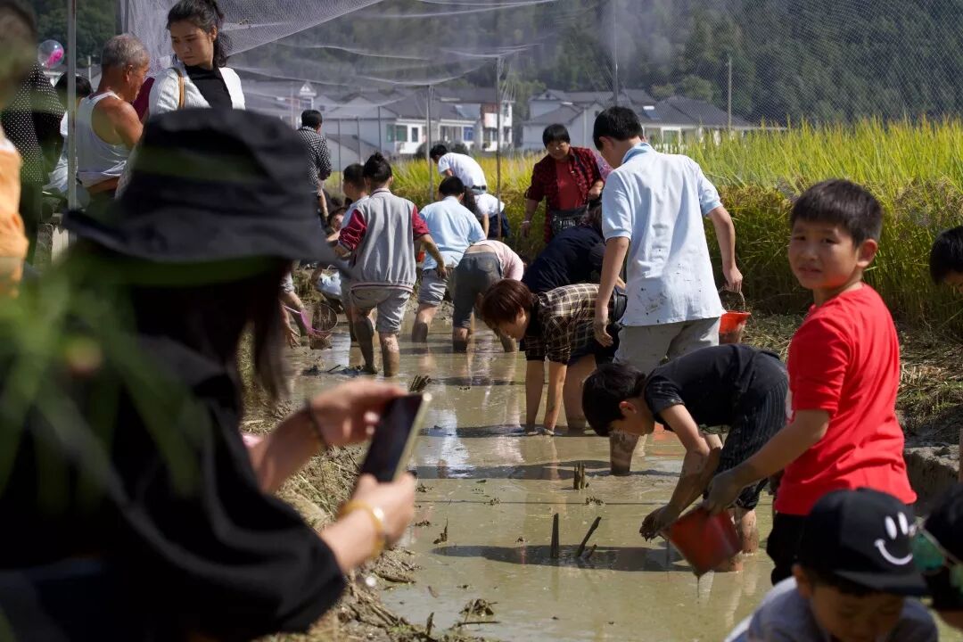 随后割稻比赛开始了,分水镇政府的部门和下属行政村组队进行了割稻比赛,大家齐头并进,争先恐后,许多小孩在父母的带领下也下田割稻,体验一把,在沟渠里父母和孩子们一起,赤脚到里面抓泥鳅,孩子们可高兴了。