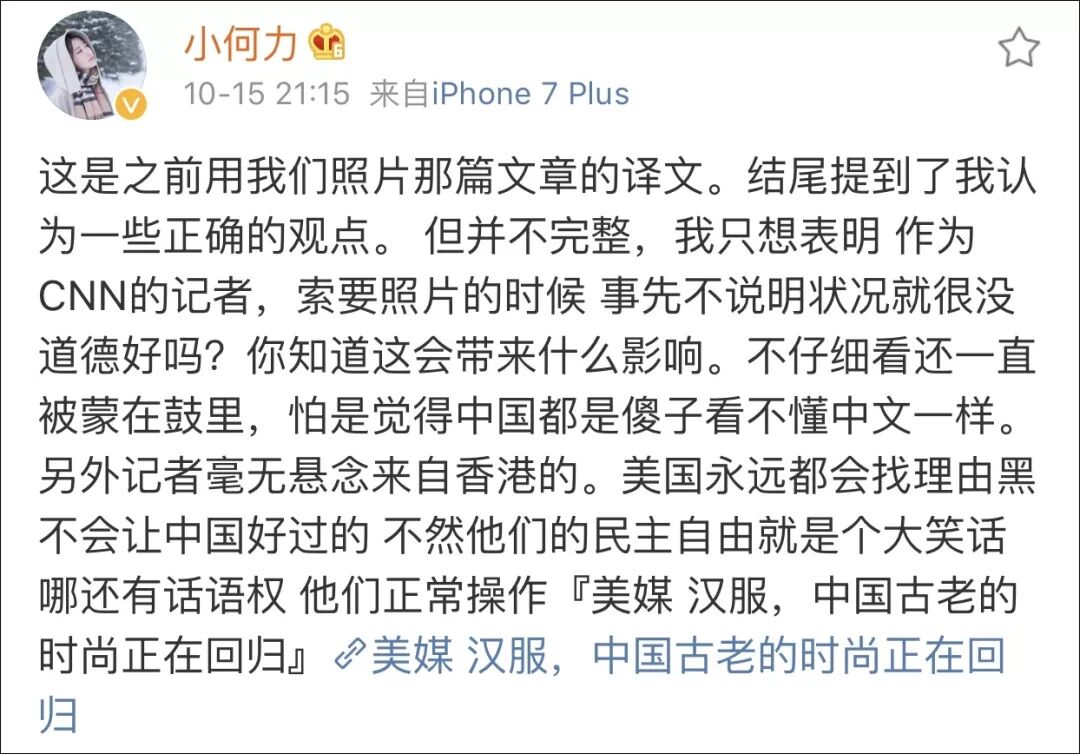去年,香港文汇报就报道过,他曾以旅游之名在香港与“港独”头目进行接触,还出席“独派”举行的反华讲座并做演讲,在他的社交媒体上,充斥着宣扬“港独”的内容。而当香港媒体准备采访他时,他又污蔑记者是“跟踪”他,认为是中国政府在阻止他和别人谈话,去年,外交部发言人还曾回应,“我觉得他的这种逻辑是非常荒谬的,也是不成立的。”那么Kevin这次是怎么说的呢?他认为,汉服盛行的缺点非常突出,因为“它强化了汉族文化,从而伤害了少数民族”。Kevin还认为,其实汉服的盛行不仅仅是年轻人喜欢那么简单,这背后有“政治成因”,在他眼里,此前,一些大的中国媒体对“年轻人喜欢汉服”的这些报道都是为了“消灭少数民族的文化”,“巩固”汉族文化。文章中,Kevin还无耻地宣称“维吾尔族学生们穿汉服都是被迫”的。显然,Kevin的论调与事实大相径庭。据外交部发言人耿爽在9月24日的新闻记者会上提到,50个国家联名致函联合国人权理事会主席,赞赏中国新疆人权事业发展成就和反恐、去极端化成果,并且一段时间以来,近千名外国使节、官员、媒体等各界人士先后访问新疆,都对当地依法打击和预防恐怖主义表示认可和赞许。Kevin却有意无视了这些重要数据与信息。此外,作者还采访了一位专门研究时尚方向的英国教授,对方和Kevin持相同观点,这一部分也正好构成了文章的结尾。以汉服的历史、发展切入文章,虽然中间夹杂着大众对汉服的认可,但观点无非是“我很喜欢”、“这是我们的自信”这些隔靴搔痒的内容,然后大篇幅去讲别人是如何唱衰汉服,如此,再回过头去看文章标题上的那句“wearing pride”,恐怕文章作者也并非那么真诚。昨天下午,CNN这篇文章的受访者、文章图片摄影@小何力 指责CNN在采访中“夹带私货”。他介绍,在接受CNN采访时,对方的相关采访内容非常平常,比如为什么拍摄汉服、对汉服文化的兴起有什么理解。其所在的@成都临溪摄影 也介绍,对方称,这篇报道是关于中国汉服,包括兴起的历史和文化发展等,完全没有提及政治问题。
