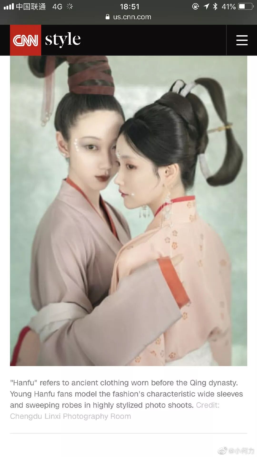 汉服在中国年轻人群体中的日渐盛行,已经成为了一种文化现象,终于引起了外媒CNN的注意。只是,在CNN眼里,汉服的复兴并不是年轻人喜欢那么简单,这背后存在着“政治性”:因为“汉服文化的盛行会削弱中国的民族多样性”、“汉服正在消除少数民族的文化”,CNN还推断,从汉服在中国的盛行可以看出“中国开放的大门正在关闭”。CNN文章中,使用了一些中国女性的汉服图,昨天(15日)下午,网友@小何力 在微博承认照片是其所拍,批评CNN事前并未告知会在文章中“夹带私货”,并要求对方删除相关图片。同时,参与收集材料的CNN实习生也表态,问题提纲与写作均非其本人经手,文章也并未署其姓名,“会尽我所能传达大家的诉求和我本人的不满,并即刻提请离职”。CNN的这篇文章以《着装自豪:卷土重来的中国“旧”时尚》为题,发表于13日。