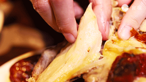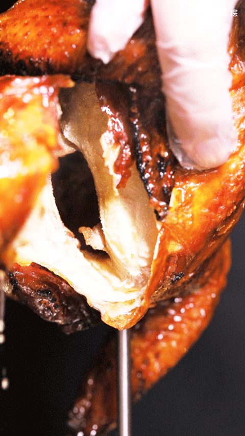 火烤过的皮没有普通烧鸡那么湿,脆到掰开可以听见咔的一声,薄薄的一片,底下没有过多的油脂,入口还能感受到酒香,广东人表示真的很有鸡味!