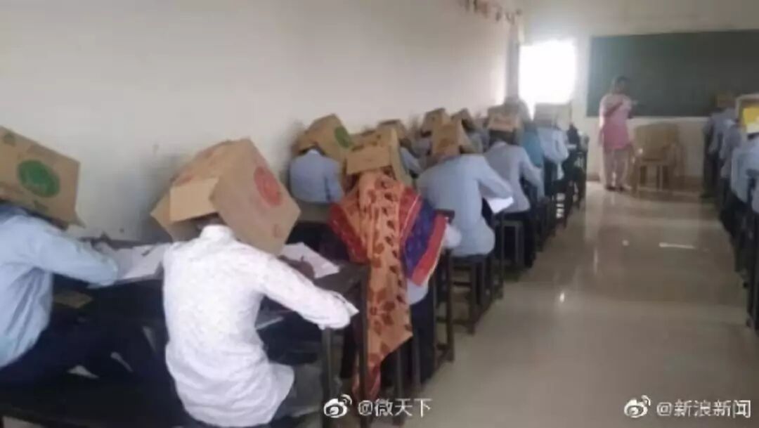 据BBC19日报道,为了防止学生在考试中互相抄袭,印度卡纳塔克邦一所预科学校想出奇葩招数,让学生们脑袋上扣着纸箱参加考试,纸箱有一面开洞以看到试卷答题。这些照片被流传后,该校一负责人公开道歉,称对采用这种非常规的反作弊手段感到抱歉,只是听说别处有用过这一方法,因此想进行试验。但负责人坚持称,这一做法得到了学生的同意,纸箱由学生自备,且此方式非强制性,照片中就有同学没有头戴纸盒参加考试。