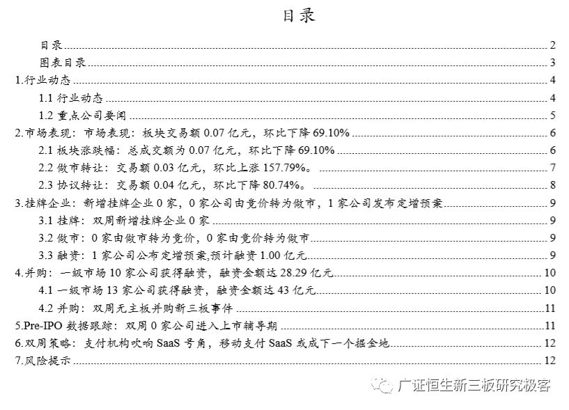 3.挂牌企业:新增挂牌企业0家,0家公司由竞价转为做市,1家公司发布定增预案