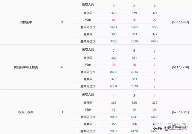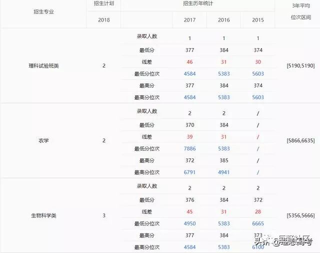 点评:从2017年招生数据来看,理科试验班、生物科学类、种子科学与工程、动物医学、经济学类专业分数较高,其他专业分数基本比该校的投档线高1-2分,但是每个专业的招生人数较少,录取偶然性增大,所以专业填报的时候需要谨慎!等2018年该校录取数据公布出来以后,我们将第一时间公布在理想志愿平台(iwish100.com),供大家参考。
