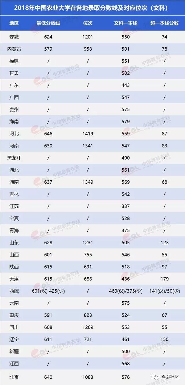 五、中国农业大学生源质量2018年,中国农业大学从录取线高出重点线分值统计来看:在有文科生招生计划的14个省中,录取分数线超出一本线80分以上的有7个,其中有4个超出一本线100分以上。理科方面,29个省中有22个省超出一本线100分及以上,其中有5个省份分数线超出一本线150分及以上。在新高考地区,上海录取最低分为540分,超重点本139本;浙江录取最低分为638分,超重点线50分。
