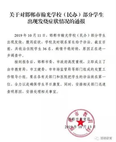 据“邯郸教育”微信公众号消息,近日,邯郸市翰光学校(民办)部分学生出现发烧、腹泻症状,学校及时联系家长给予诊治。截至目前,共收治住院学生36名,病情平稳好转,原因正在进步调查中。